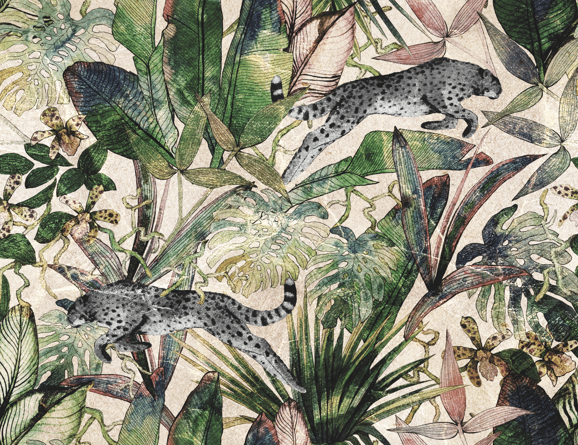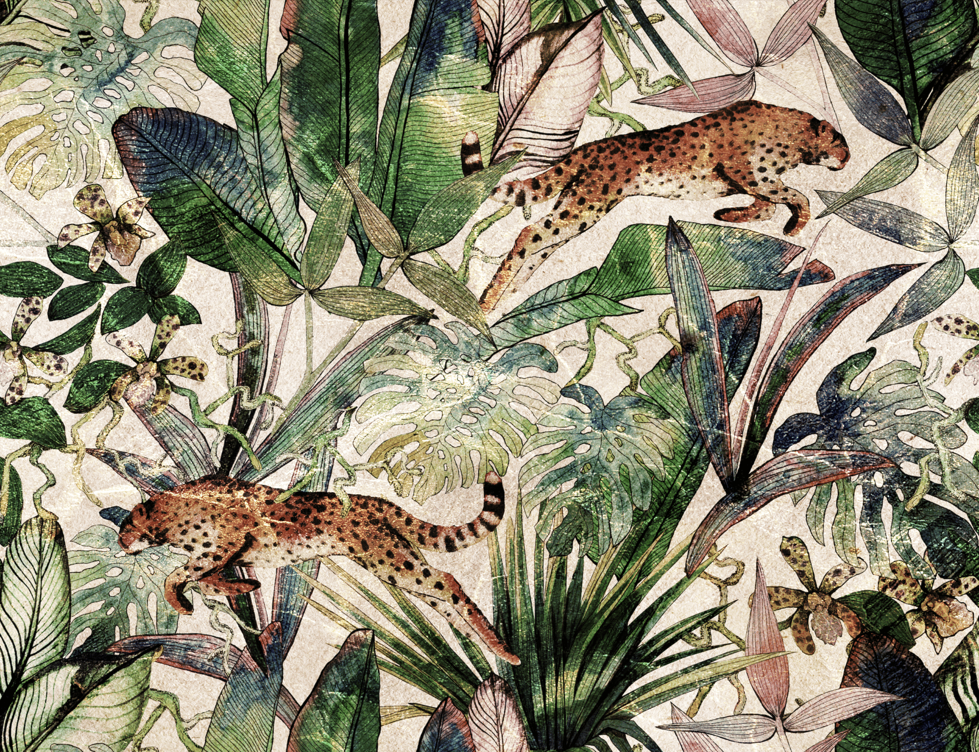 Die fein gezeichneten Pflanzen entfalten sich wie ein botanisches Tagebuch, während die Leoparden scheinbar jede Sekunde zum Sprung ansetzen. Dieses Motiv ist nicht nur Tapete, sondern ein Szenario – wie ein eingefrorener Moment im Urwald, voller Spannung und Poesie.