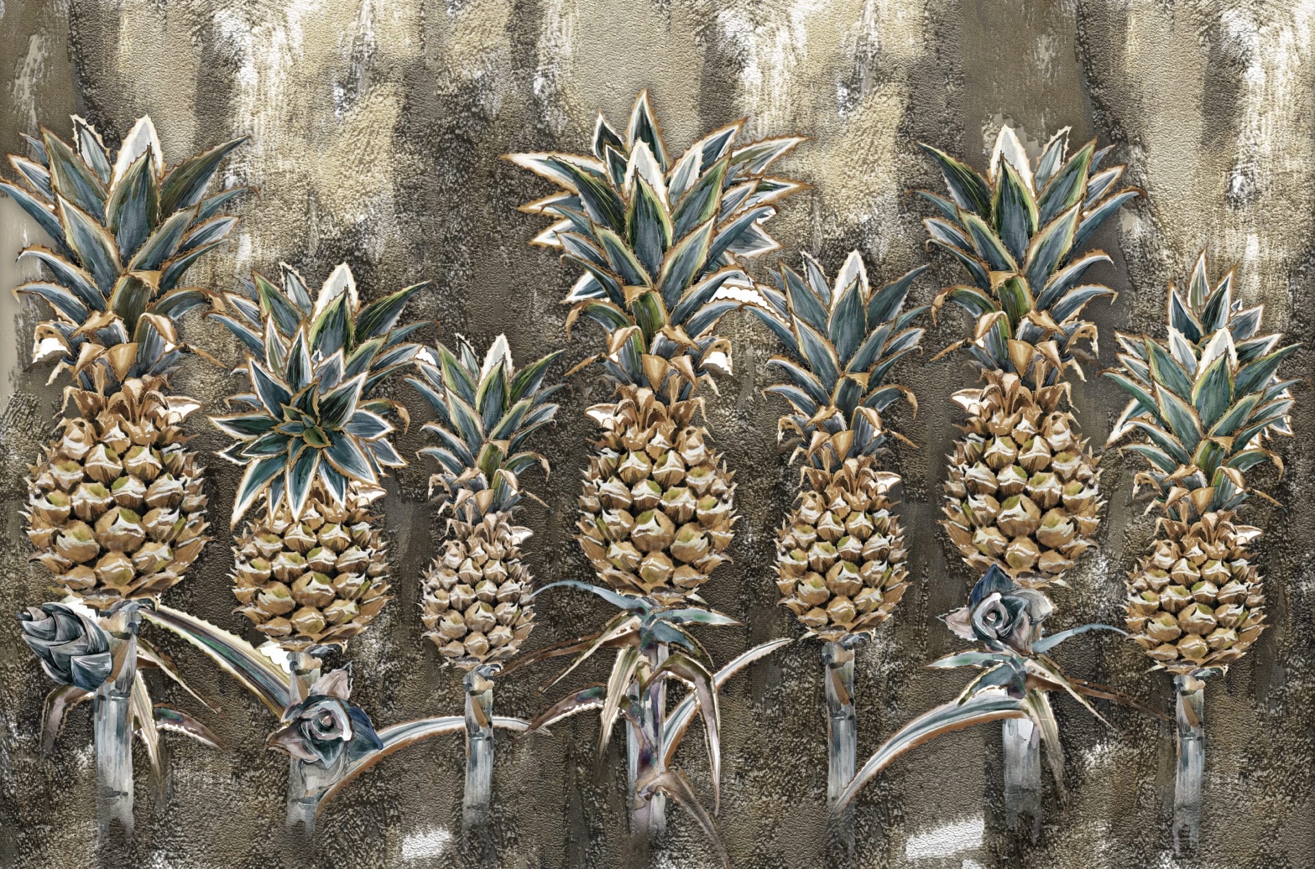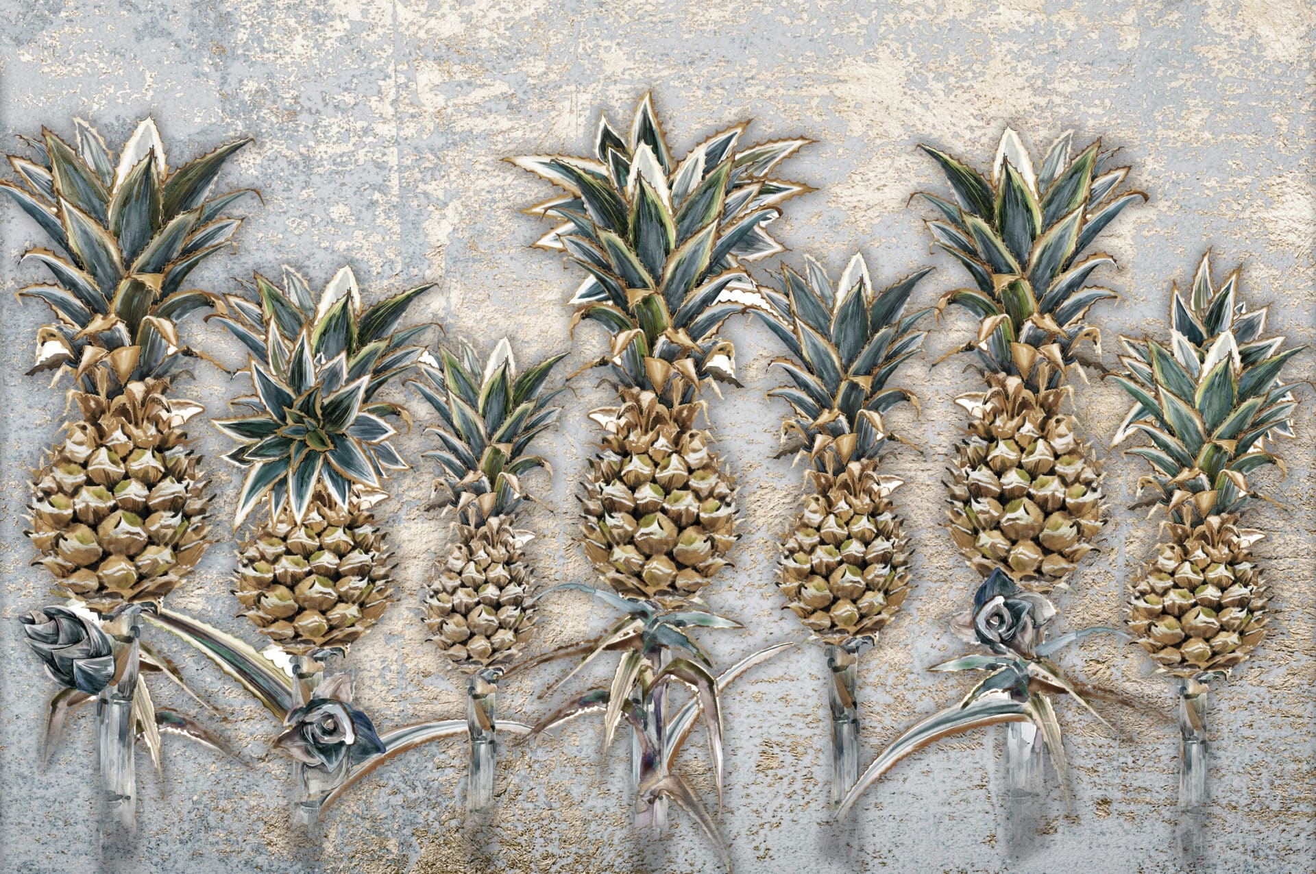 Wie eine Parade aus exotischen Gewächsen reihen sich die Ananas auf – aufrecht, würdevoll, fast majestätisch. „Ananas“ verbindet tropische Fülle mit einer zurückhaltenden Farbpalette. Die Früchte wirken modelliert, fast plastisch, eingebettet in eine rau gemalte Hintergrundtextur, die an verwaschene Mauern oder sonnengegerbte Wände erinnert.