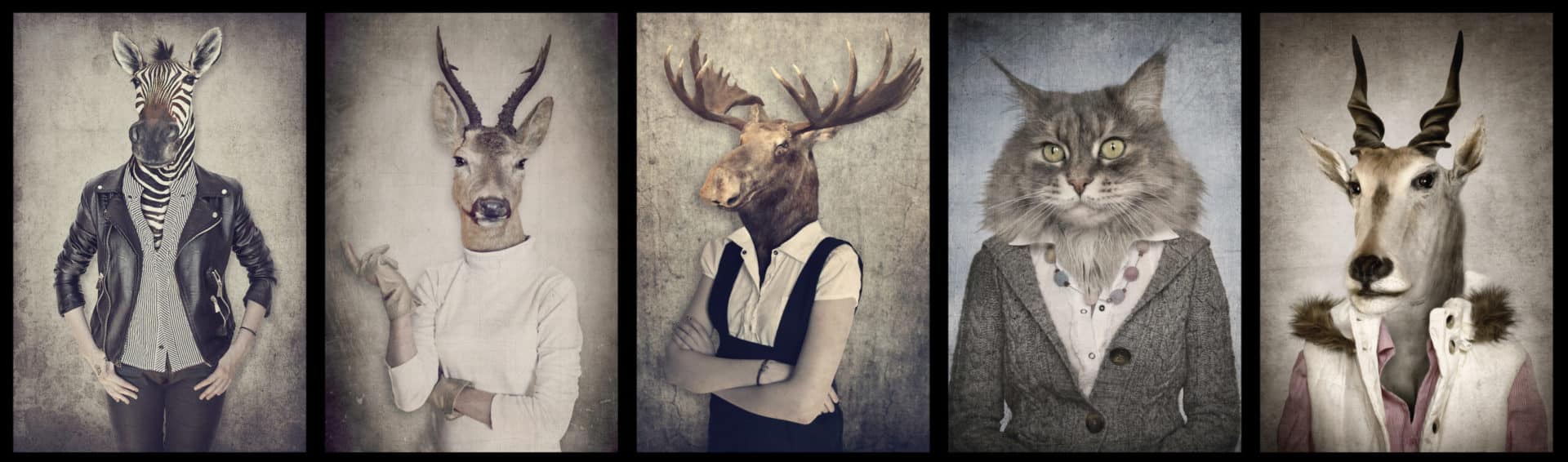 Wer sagt, dass Stil nur eine Frage der Spezies ist? „Belegschaft“ bringt Tierporträts ins Spiel – detailverliebt, charmant und augenzwinkernd. Zebra, Hirsch, Elch, Wildkatze und Antilope tragen feines Outfit, klare Haltung und überraschend viel Charakter.