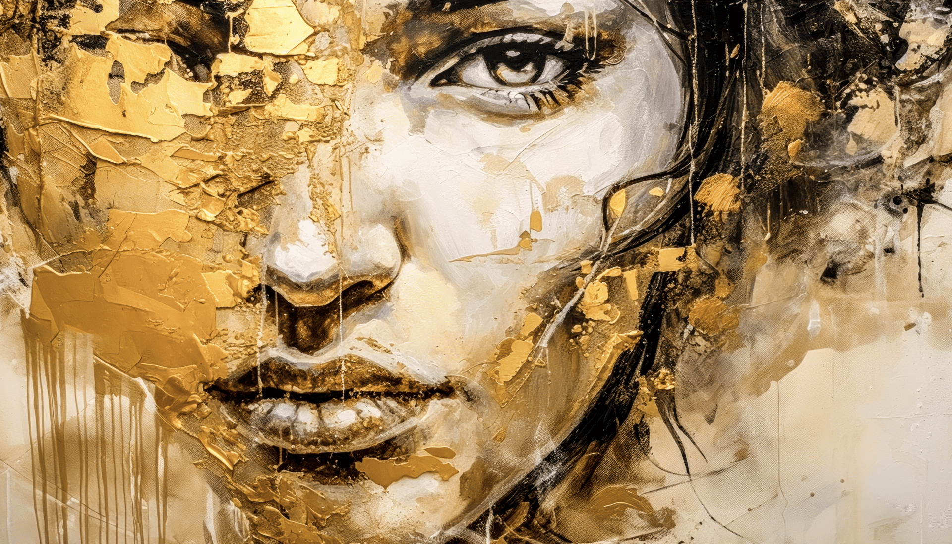 „Bijou“ ist ein Porträt in Explosion – aus Farbe, Emotion und schimmerndem Metall. Das Gesicht einer Frau tritt aus der Leinwand hervor, teils realistisch, teils aufgebrochen wie gelebte Oberfläche. Goldene Spachtelmasse liegt über der Haut wie gelebte Geschichte, erzählt von Kraft, Verletzlichkeit und Stolz.