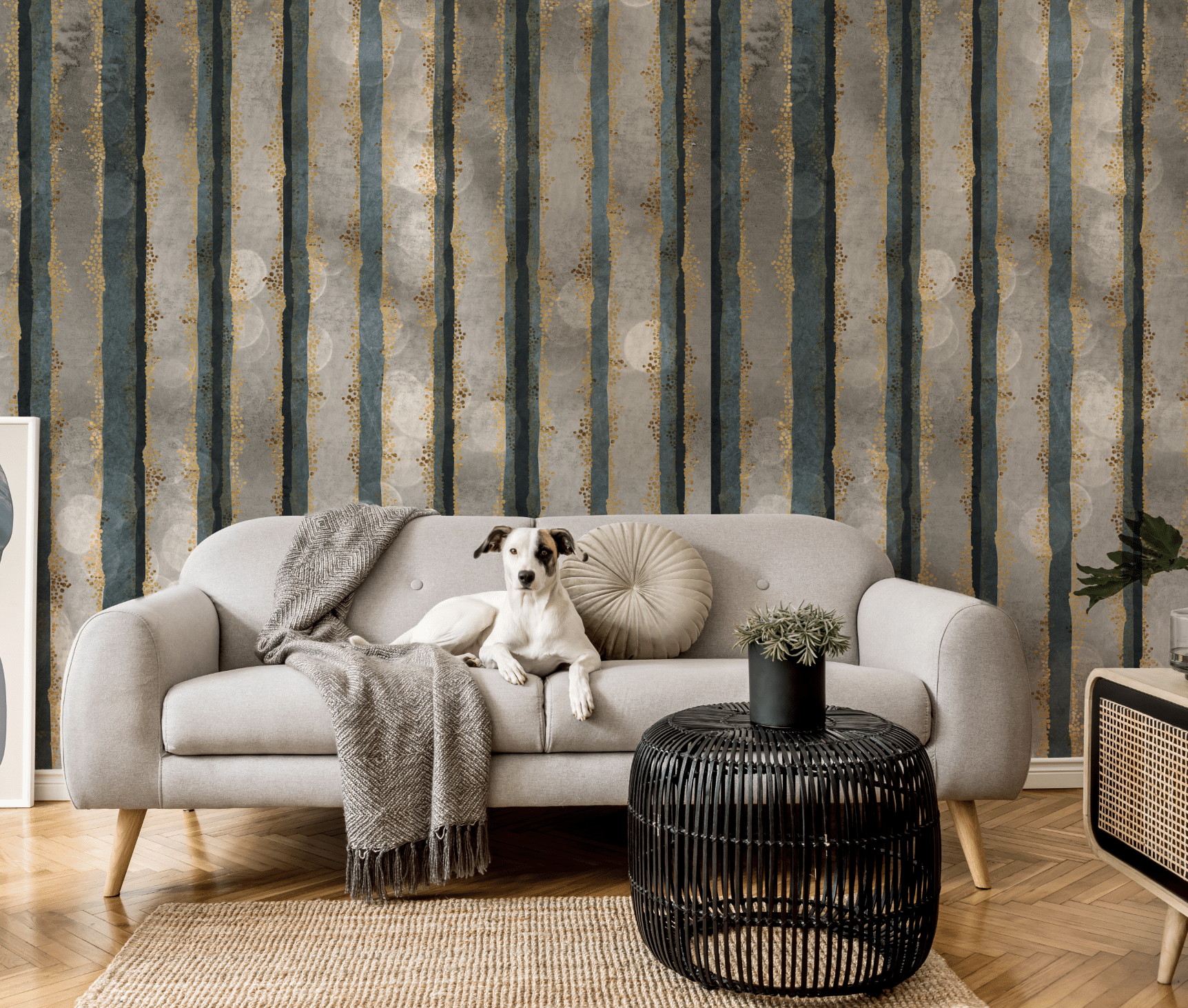 Die Farbwelt: tiefes Blaugrün, metallisches Gold, steingraue Grundtöne mit schimmerndem Unterton. Die Wirkung: ruhig, rhythmisch, edel. Ideal für moderne Wohnbereiche, Flure mit architektonischem Anspruch, elegante Schlafzimmer oder Hotelinterieurs mit Charakter.