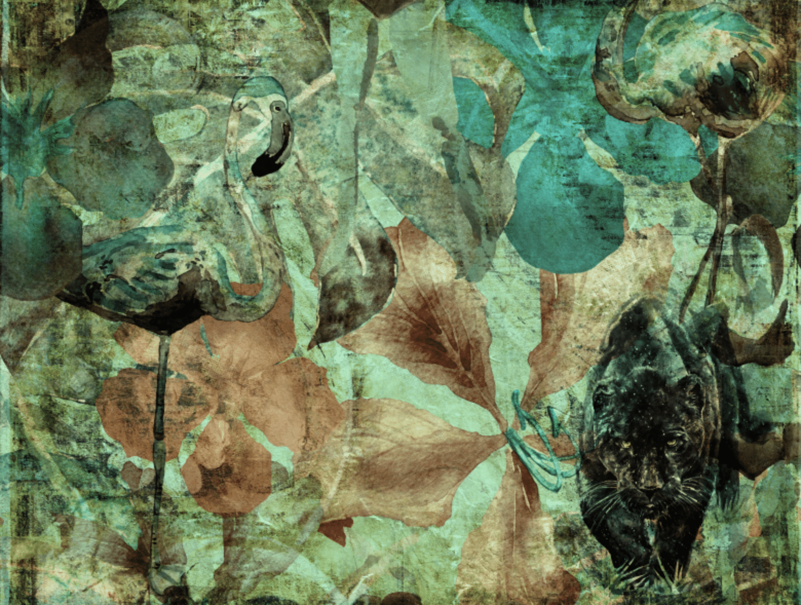 Im Zentrum dieses dichten, geheimnisvoll schattierten Dschungelmotivs steht der schwarze Panther – majestätisch, ruhig, kraftvoll. Umgeben von tropischen Blättern, Flamingos und gedämpften Erdtönen entfaltet sich eine Kulisse voller Tiefe und Spannung. Die Komposition wirkt wie eine Szene aus einem nächtlichen Regenwald, eingefangen in leiser Bewegung.