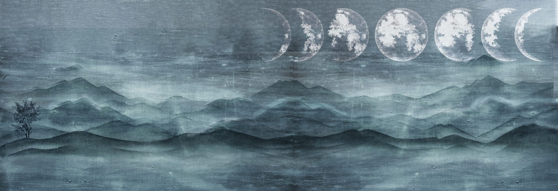 „Blaue Wüste“ ist Meditation in Bildform. Sanfte Hügelzüge breiten sich in Schichten aus – wie Nebel, wie Wasser, wie Erinnerung. Darüber zieht der Mond in all seinen Phasen still seine Bahn, als würde er Zeit sichtbar machen. Alles fließt. Nichts drängt.