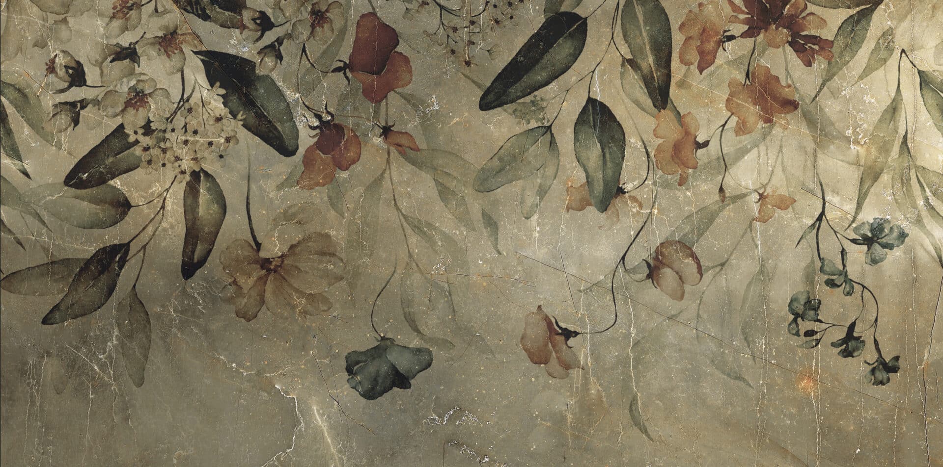 Zarte Blätter tanzen im Spiel von Licht und Patina, als würden sie langsam vom goldenen Abendlicht berührt. Der Untergrund aus verwitterter Steintextur gibt dem Motiv Tiefe – wie eine antike Wandmalerei, freigelegt aus der Zeit. Florales Vergehen trifft auf gelebte Eleganz.