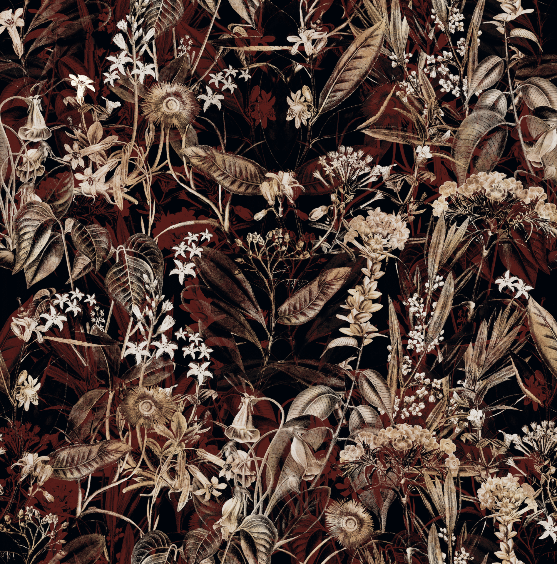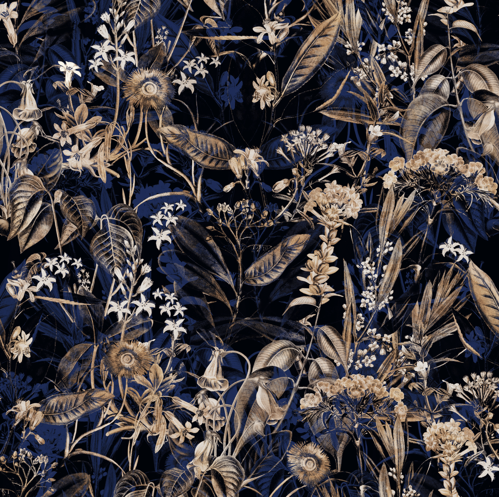 „British Golden“ erinnert an botanische Studien aus alten englischen Gewächshäusern – nur dass hier das Licht aus der Tiefe kommt. Auf dunklem Grund erblühen fein gezeichnete Blätter und florale Motive in Nuancen von Gold, Ocker, Creme und Espresso. Wie getrocknete Pflanzen in einem viktorianischen Herbarium wirken sie kostbar und geheimnisvoll zugleich.