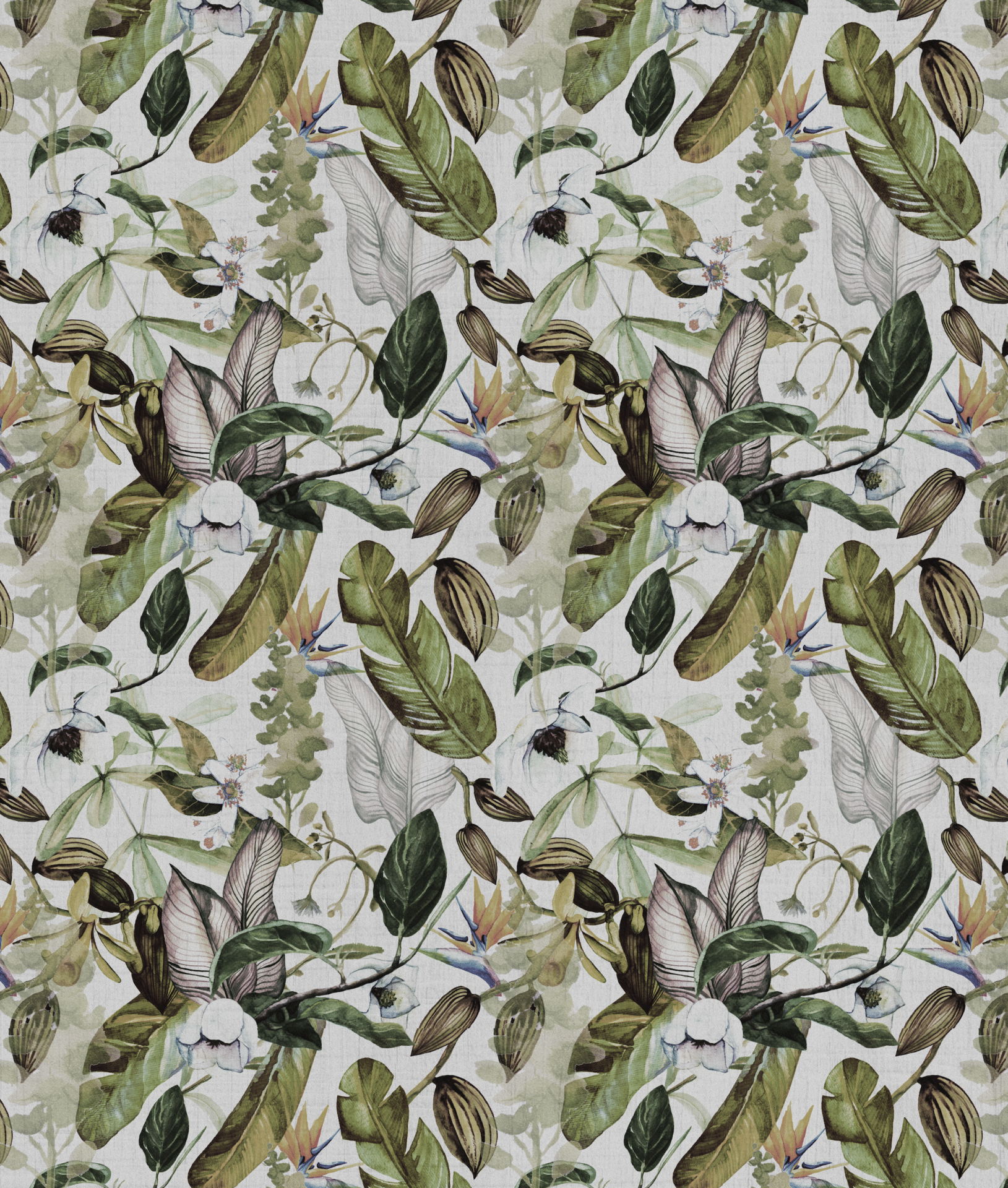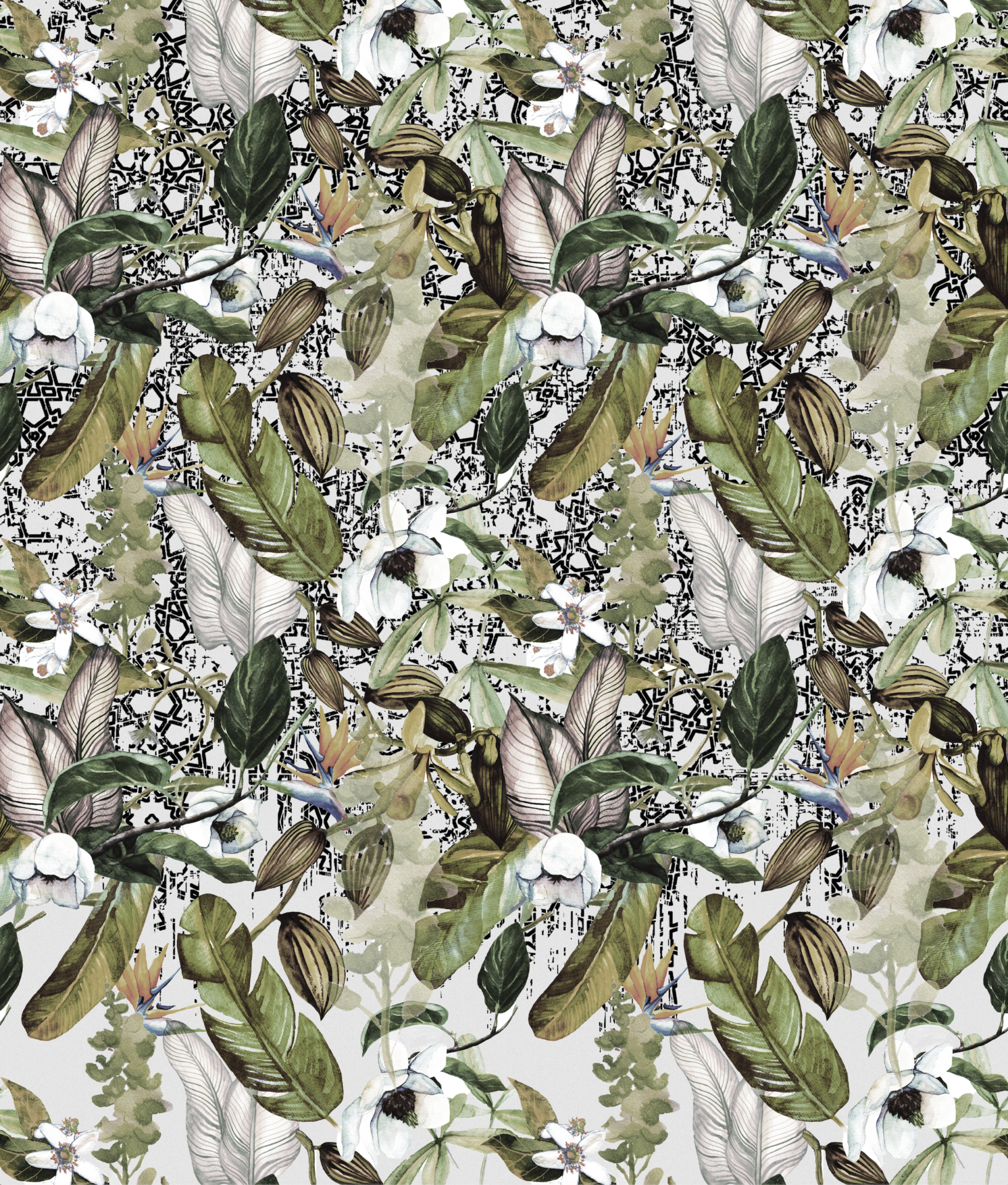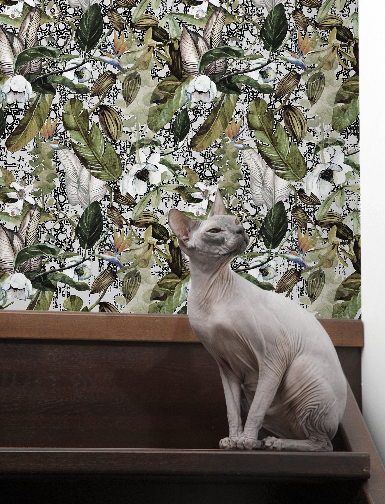 Ein florales Spiel aus Formen, Farben und Codes: „Cat One“ verbindet opulente tropische Vegetation mit einem auffälligen, beinahe digitalen Hintergrund. Zwischen großblättrigem Grün, filigranen Orchideen und exotischen Vögeln blitzt ein Mosaik aus schwarz-weißen Pixelstrukturen hervor – als würde die Natur mit dem Digitalen verschmelzen.