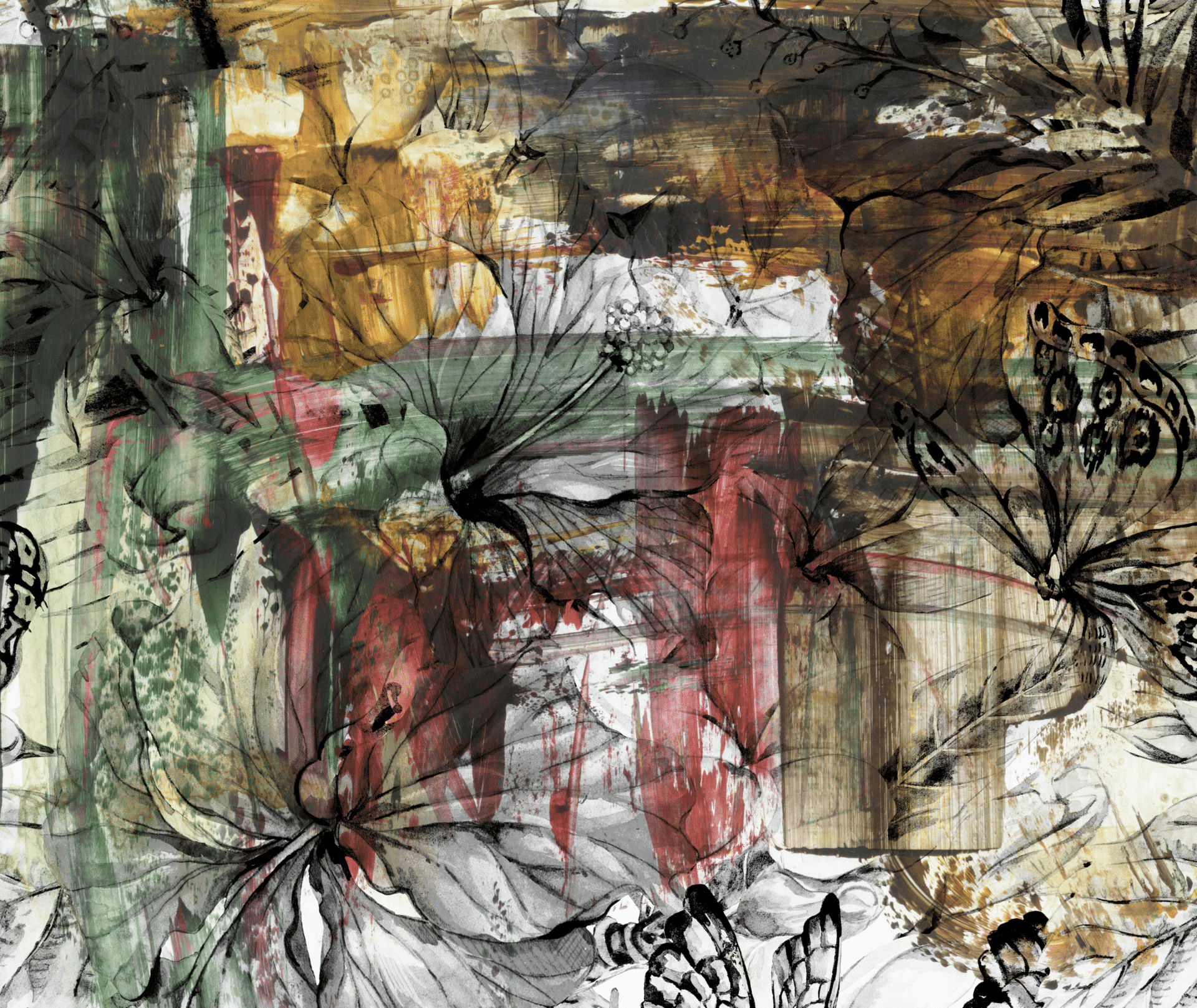 Grün, Rostrot, Senfgelb und Schwarz ziehen sich wie Spuren durch die Komposition, verwischt, verwoben, aufgebrochen – die einzelnen Formen scheinen zu fliegen, zu wachsen, zu verschwinden. Zarte Linien treffen auf grobe Pinselzüge, florale Elemente auf abstrakte Geste.