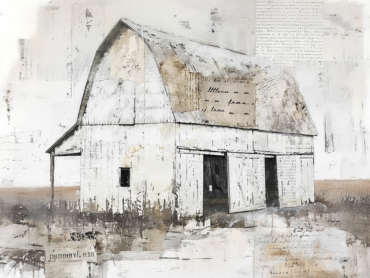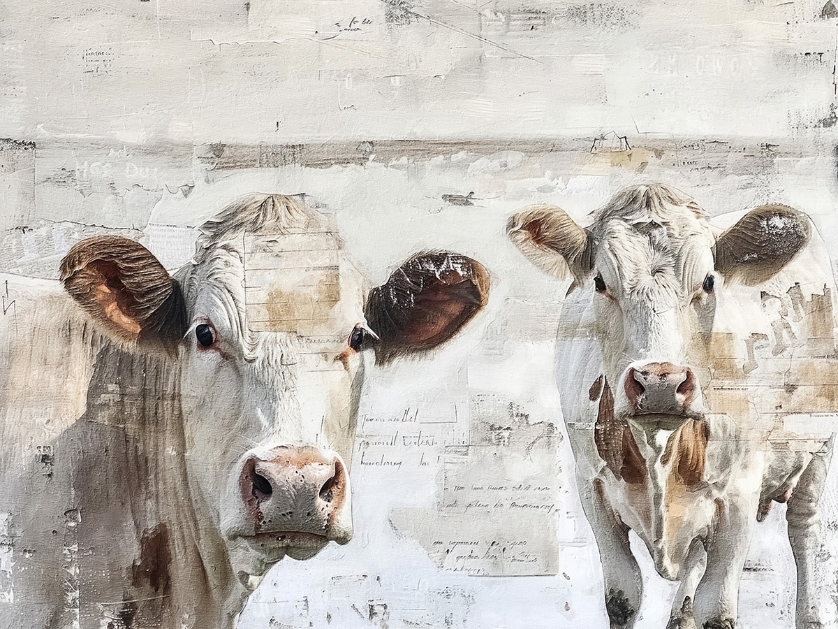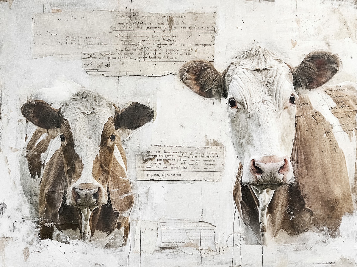 Die Farbpalette: gedecktes Weiß, Lehm, Ocker, milchiges Grau. Die Collage-Elemente im Hintergrund – Notizen, Briefe, alte Skizzen – verleihen Tiefe und Textur. Cowmania wirkt wie ein visuelles Tagebuch eines Lebens zwischen Stallgeruch, Stille und Weitblick.