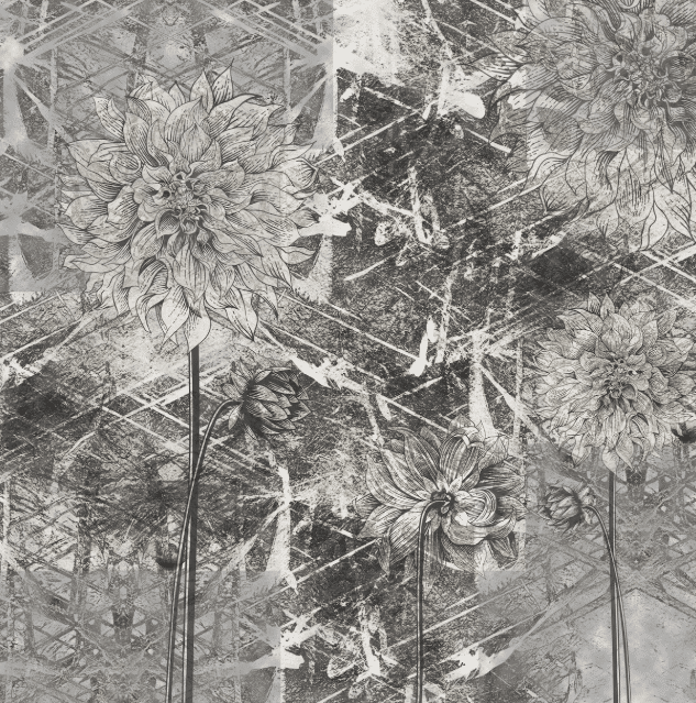 Die monochrome Farbwelt in Schattierungen von Grau, Weiß und Schwarz verstärkt die grafische Wirkung. Kratzspuren, Linien und abstrakte Flächen erzeugen Tiefe und Rhythmus – fast wie eine visuelle Partitur, in der jede Blüte ihr eigenes Thema trägt. Das Motiv wirkt gleichzeitig wild und geordnet, sinnlich und rau.