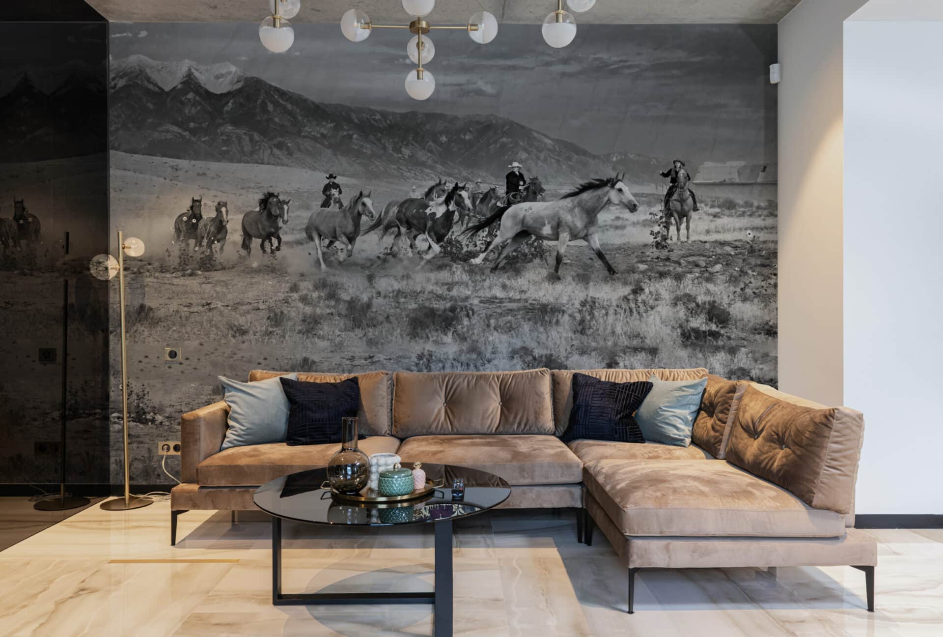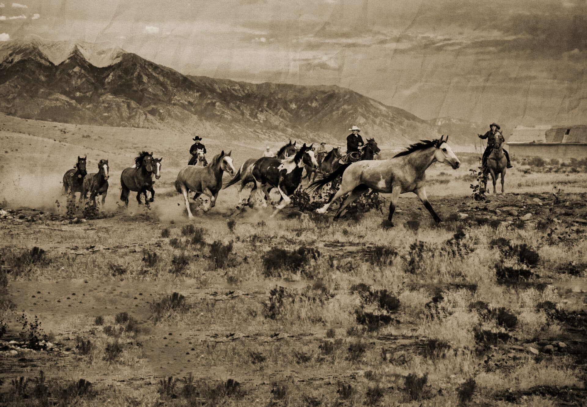 „Wilder Westen“ erzählt von Aufbruch und Abenteuer – von Hufen, die Staub aufwirbeln und Geschichten, die sich im Wind verlieren. Eine Momentaufnahme in Sepia, voller Energie und Spannung. Pferde galoppieren durch die offene Prärie, begleitet von Reitern, die wirken wie Silhouetten aus einer anderen Zeit.