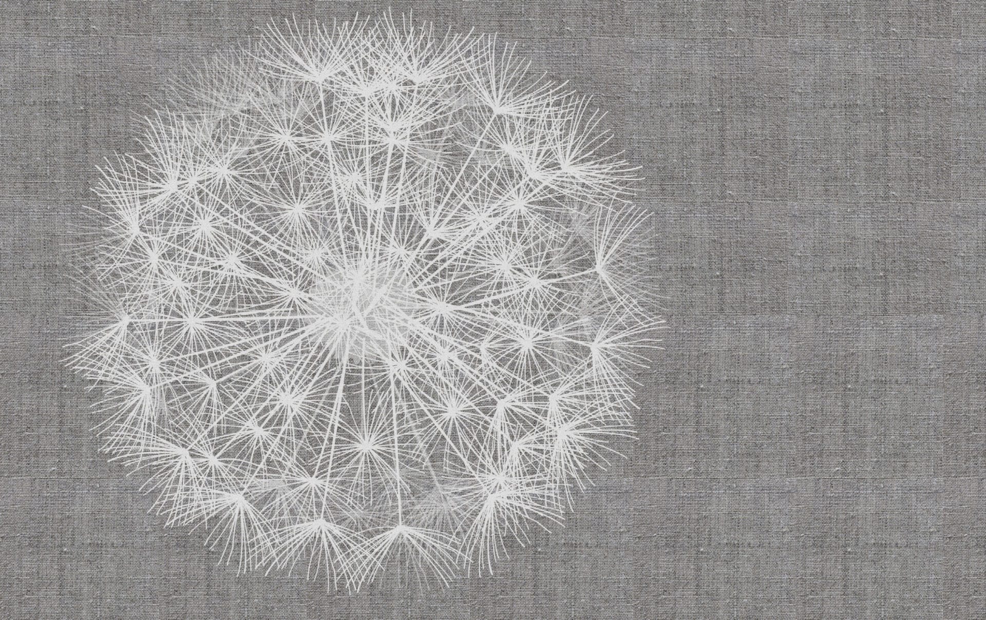 In „Dandelion“ entfaltet sich die Poesie des Augenblicks: Eine filigrane Pusteblume, in leuchtendem Weiß auf einem feinen, textilen Grau-Hintergrund gezeichnet, scheint fast zu schweben. Die radiale Struktur aus feinsten Linien erinnert an die Magie des Wünschens, an Leichtigkeit, Wind und Freiheit.