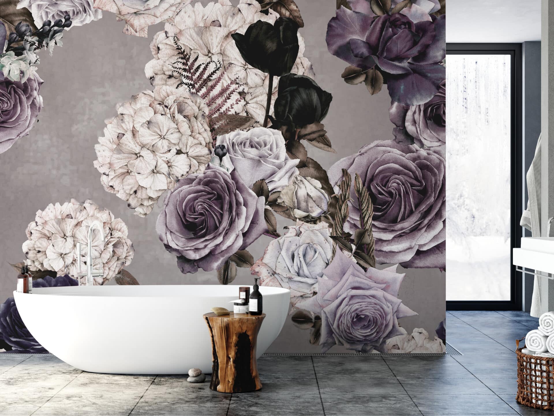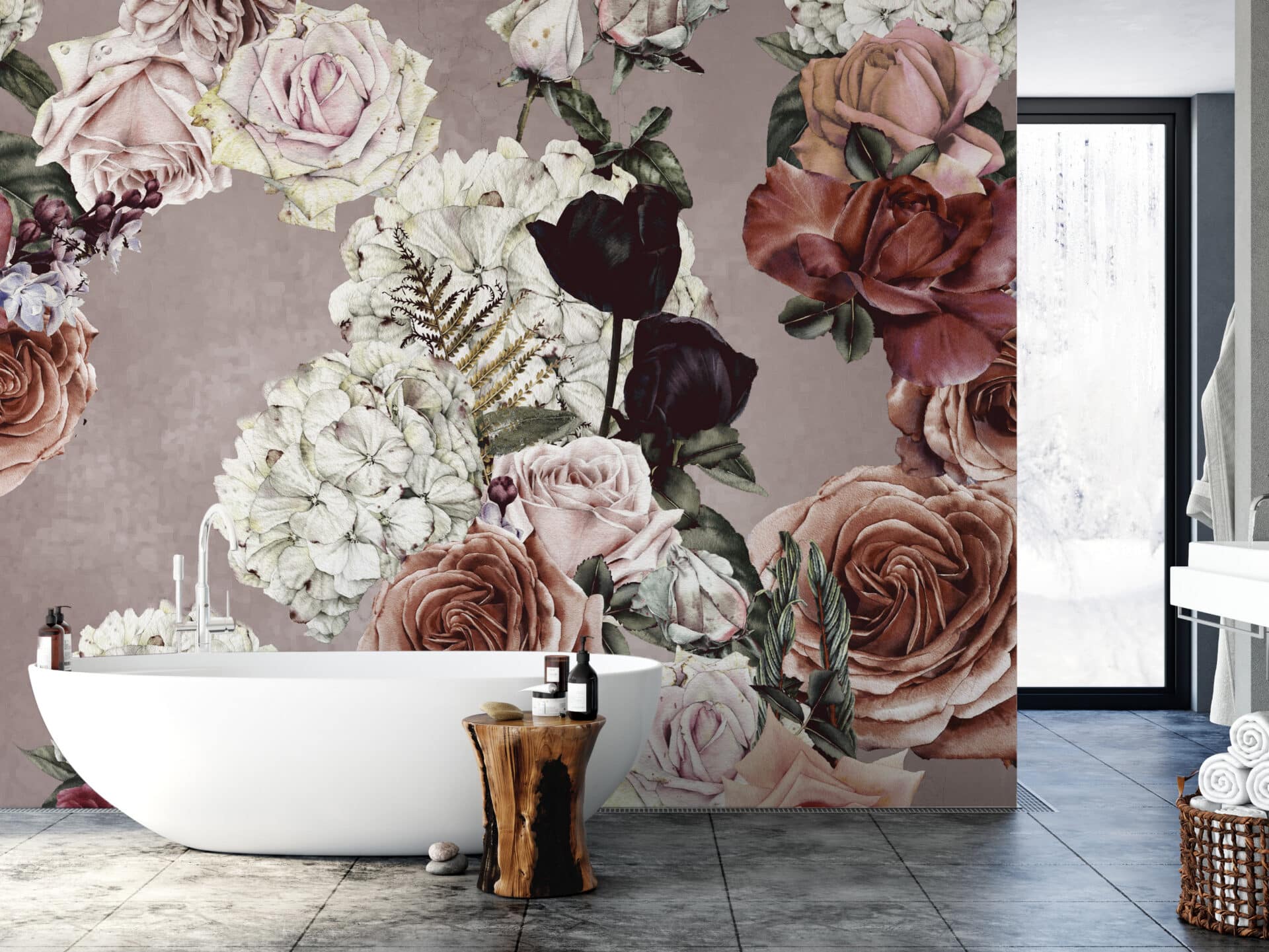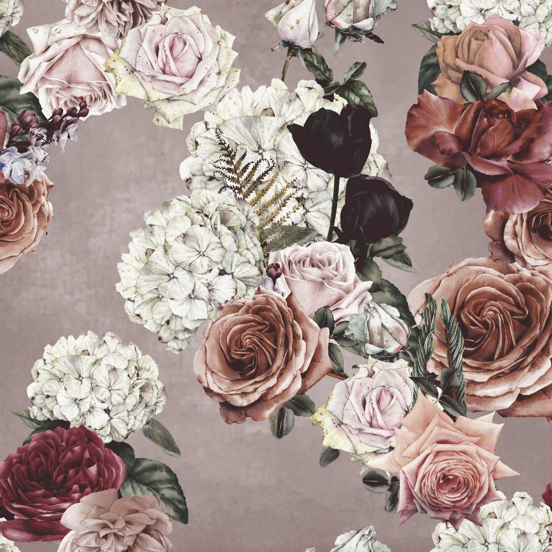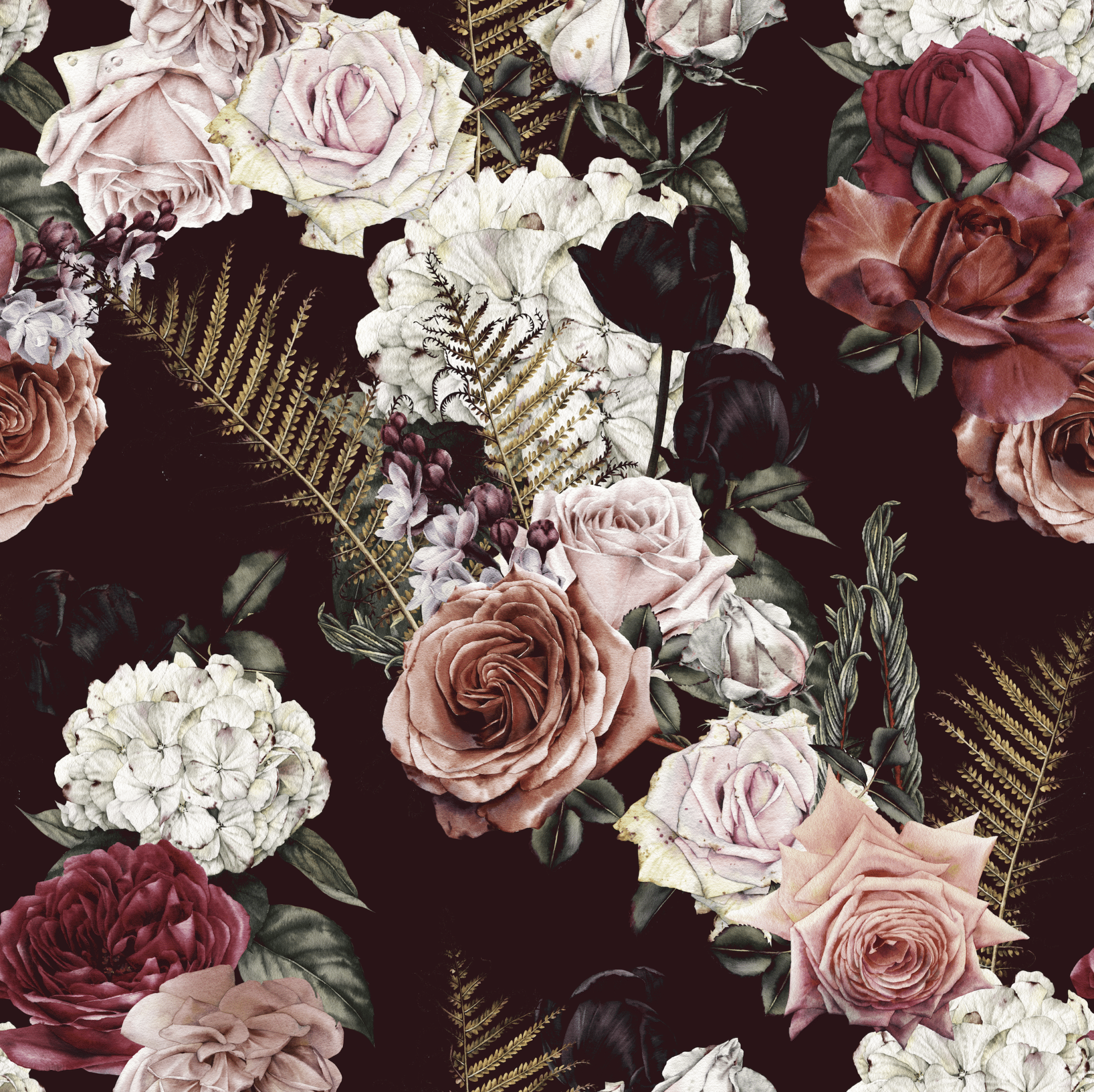 „Dark Floral“ entführt in ein geheimnisvolles Blütenmeer, in dem üppige Rosen, Hortensien und Farne in samtigem Licht erstrahlen. Die florale Pracht entfaltet sich vor tiefdunklem Hintergrund – dramatisch, sinnlich, fast barock. Die feine Schattierung der Blüten reicht von zartem Rosé über Altrosa bis zu tiefem Schwarzrot, durchzogen von goldenen Farnakzenten.