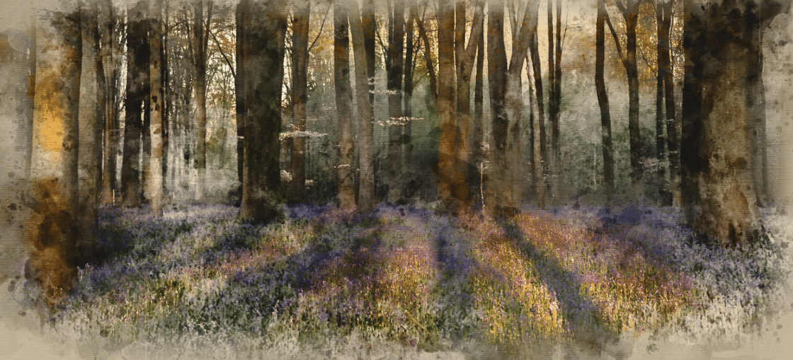 Dieses Motiv ist wie ein stiller Morgen im Wald – wenn der Nebel noch zwischen den Bäumen hängt und die ersten Sonnenstrahlen das Unterholz berühren. Am Waldboden breitet sich ein Teppich aus: zarte Blaublüten, durchzogen von violetten und gelben Akzenten, wie gemalt mit lichtdurchfluteter Aquarelltusche.