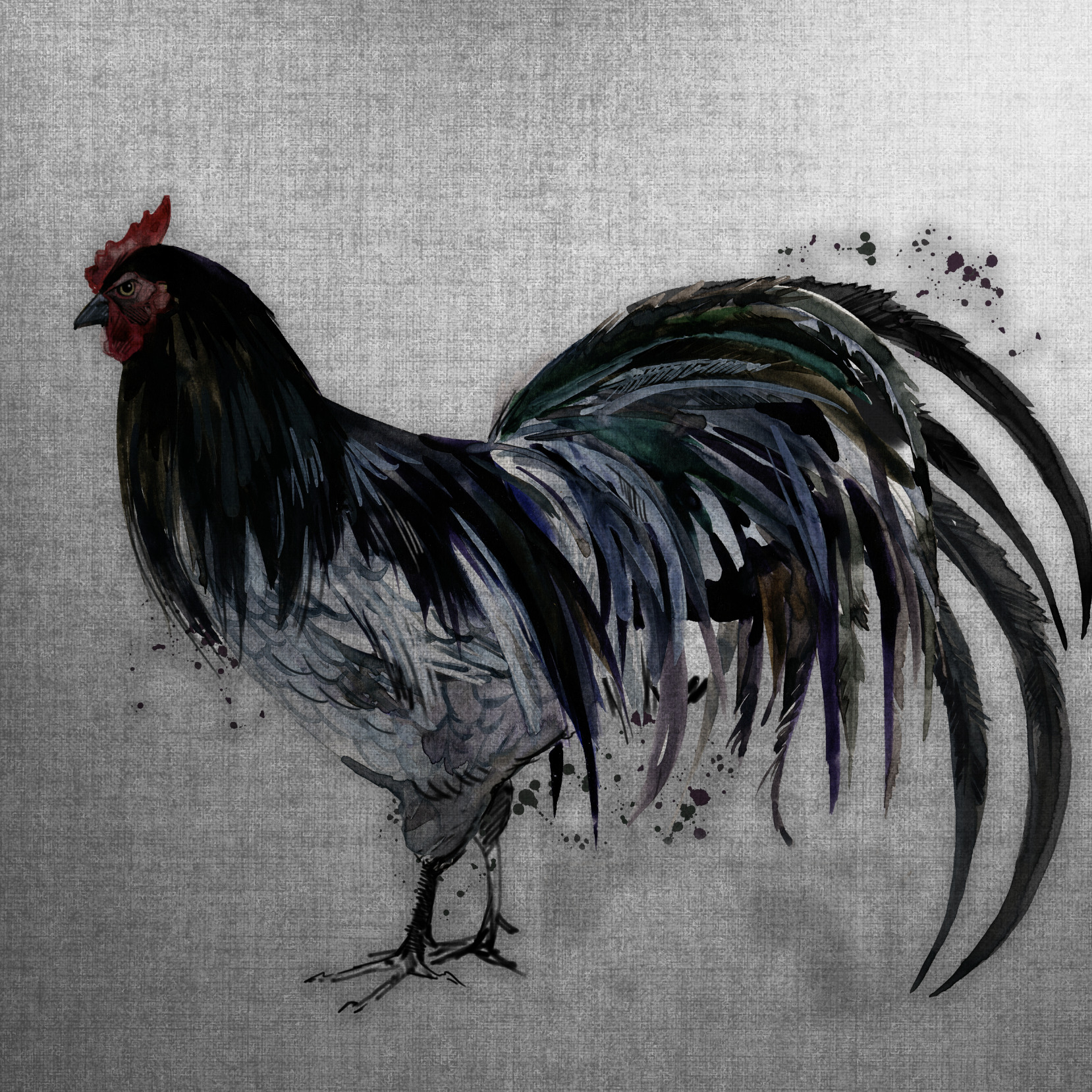Ein Auftritt, der nicht übersehen werden will: „Der Hahn“ fängt den Moment ein, in dem Präsenz zur Kunstform wird. Auf rauem Leinwandgrund erhebt sich das Tier in vollendeter Eleganz – jede Feder scheint mit Tusche gezeichnet, jede Linie bewusst gesetzt. Der Blick des Hahns ist wachsam, sein Stand souverän, seine Erscheinung fast königlich.