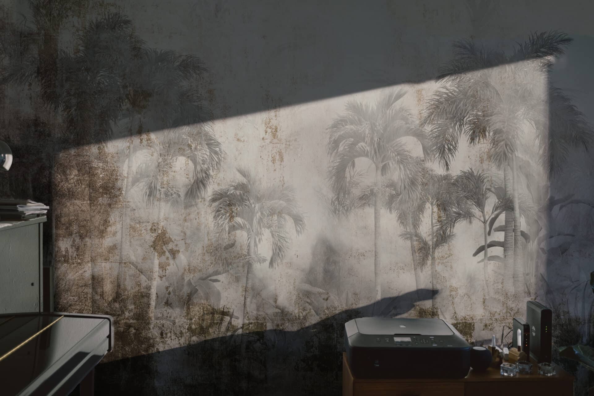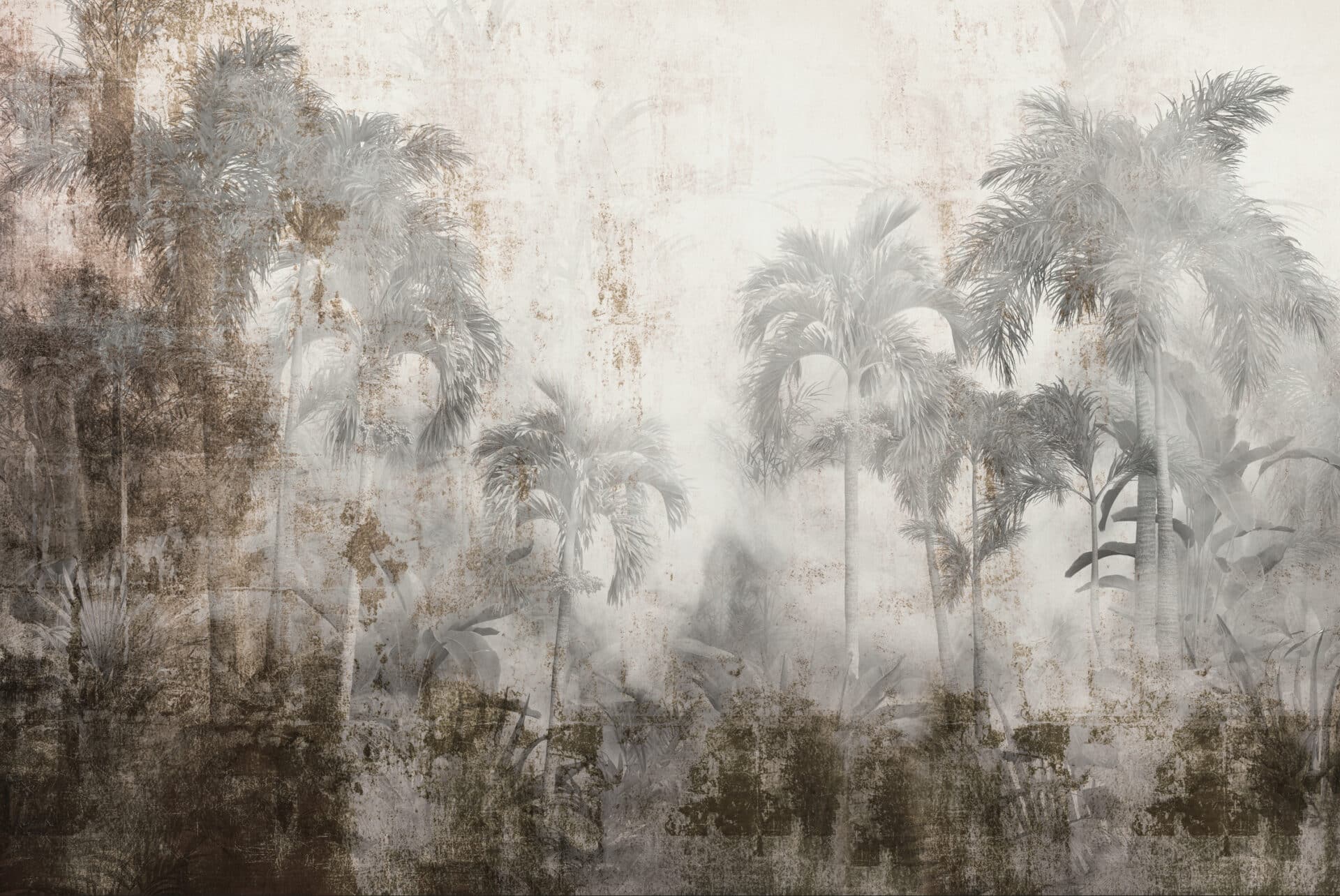 Verwaschene Grau- und Brauntöne treffen auf schimmerndes Lichtweiß. Der Hintergrund wirkt verwittert, fast wie gealterter Putz, der Geschichten zu erzählen scheint. In dieser Balance aus Tropenflair und industrieller Textur entsteht ein Bild von zeitloser Tiefe – rau, poetisch, atmosphärisch dicht.