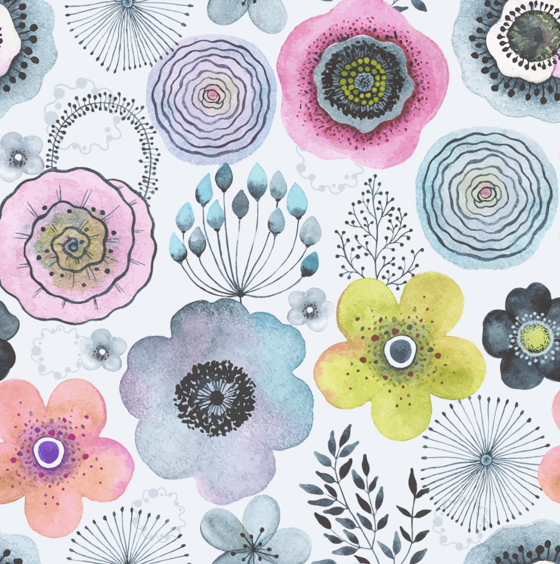 Wie ein aufgeschlagenes Skizzenbuch voll kindlicher Fantasie entfaltet sich „Ein Kinderspiel“ in zarten Aquarelltönen. Blumen in Pastellfarben tanzen über die Fläche: lavendelfarbene Blüten, gelbe Sprenkel, rosa Wirbel, feine Schwarzlinien – alles scheint handgemalt und liebevoll platziert. Die Formen sind verspielt, weich und voller Bewegung – wie eine fröhliche Entdeckungstour durch einen magischen Garten.