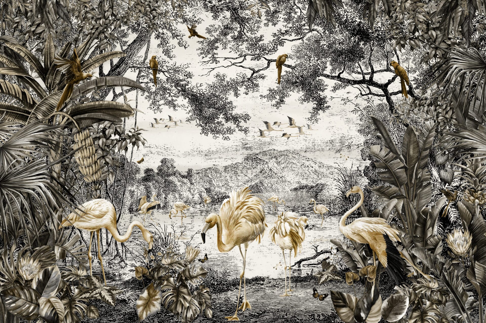 „Eine Liebe in Paris“ erzählt von einer Zeit, die nicht vergeht – eine schwarz-goldene Dschungelphantasie, durchzogen von tropischem Blattwerk, eleganten Flamingos und flatternden Papageien. Inmitten der exotischen Fülle liegt eine stille Zärtlichkeit, als hätte jemand die Tropen durch die Linse eines nostalgischen Pariser Moments betrachtet.