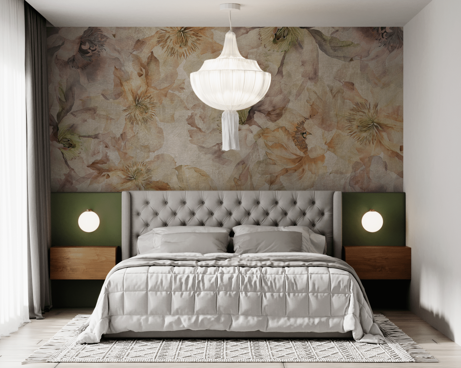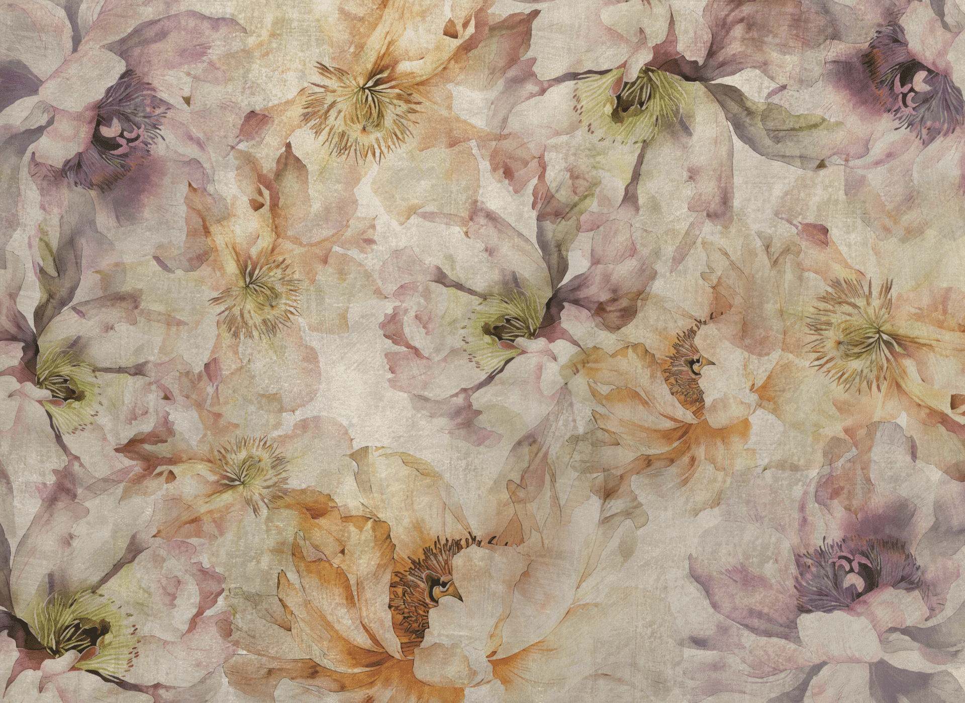 Flori ist ein florales Kunstwerk, das nicht dekoriert – sondern verzaubert. Zarte Blüten in Pastellnuancen, lasierend übereinandergelegt, entfalten sich wie eine sanfte Bewegung auf der Wand. Die Farbpalette reicht von Altrosa und Apricot über Lavendel und Creme bis zu Hauch von Grün und Grau. Alles wirkt wie auf atmender Leinwand gemalt – lebendig, aber nie laut.