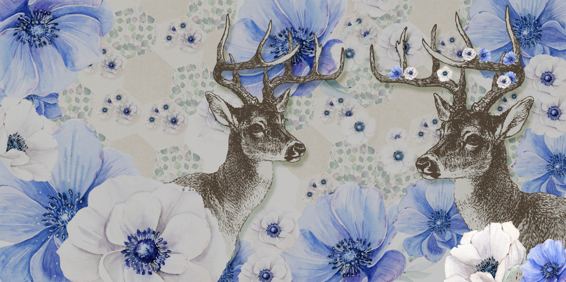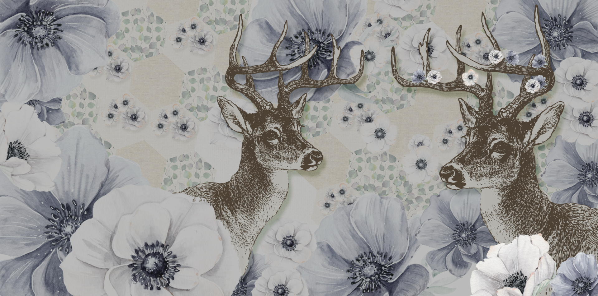 Die kühle Farbpalette – Himmelblau, Silbergrau, gebrochenes Weiß und zartes Grün im Hintergrund – verleiht der Tapete eine elegante Zurückhaltung. Die Blüten wirken wie gepresst, als wären sie Erinnerungen an eine stille Landschaft. Dazwischen: die Hirsche – würdevoll, zentriert, ruhig.