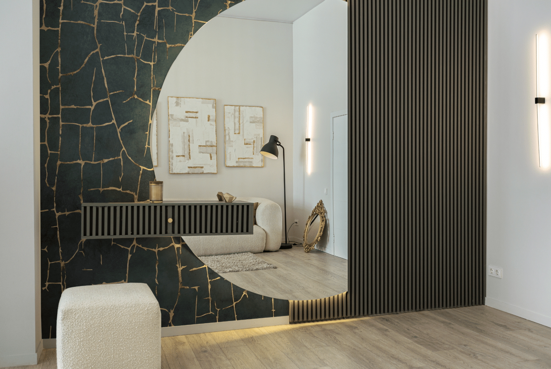 Gedruckt auf hochwertiger Leinwandtapete von Syndikat4, mit fühlbarer Oberfläche und handgearbeitetem Charakter. Handgefertigt in unserer Manufaktur – individuell skalierbar. Ideal für moderne Räume mit Tiefe: Galerien, minimalistische Wohnbereiche, Spa-Zonen oder stilvolle Eingangsbereiche.