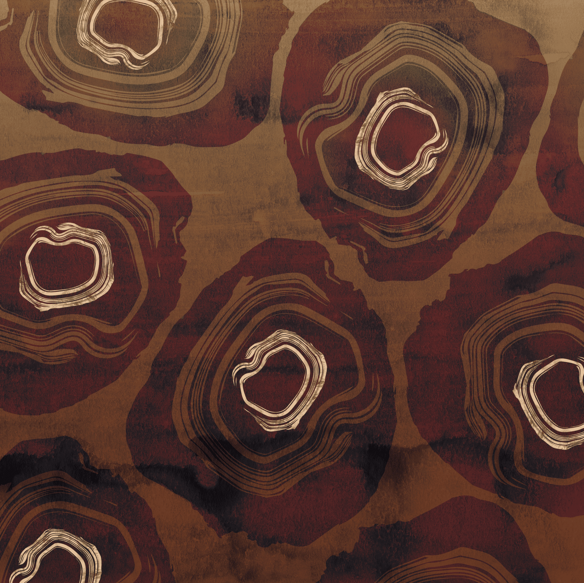 Die Farbpalette ist kraftvoll und tief: warmes Braun, dunkles Bordeaux, fließendes Schwarz – durchzogen von feinen, goldenen Akzenten. Die Komposition wirkt wie ein Ornament der Erde, reich an Struktur, Tiefe und Bedeutung.