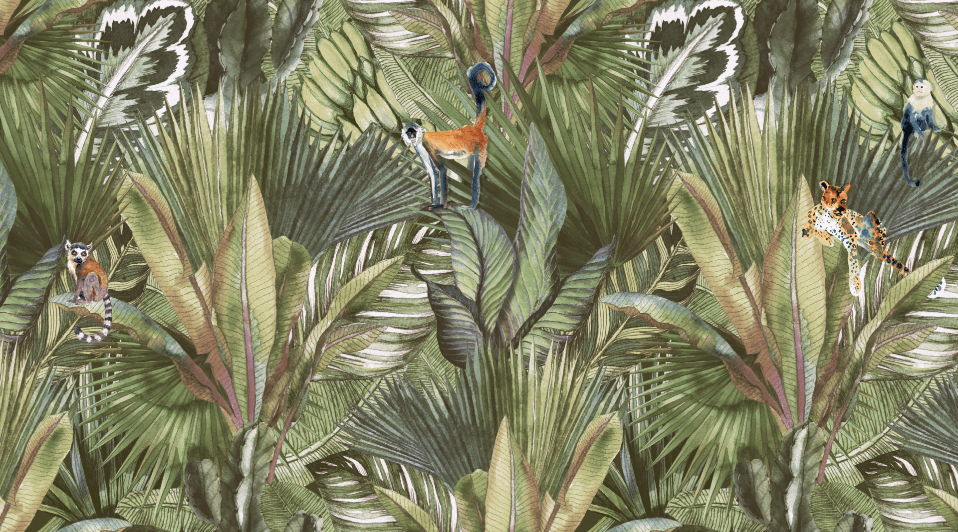 „Great Apes“ entführt in das pulsierende Herz des Dschungels – dorthin, wo das Licht gefiltert durch riesige Blätter fällt, wo Tiere aus dem Dickicht auftauchen wie Gedanken aus der Tiefe. Verspielt, neugierig und kraftvoll zugleich blicken Lemuren, Leoparden und Primaten zwischen Palmen und Farn hervor.
