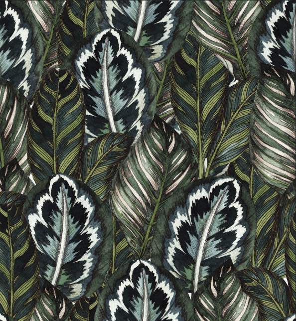In „Green One“ entfaltet sich ein dichter, ornamentaler Teppich aus tropischen Blättern – kunstvoll arrangiert, als wäre jedes Blatt Teil eines geheimen botanischen Mosaiks. Dunkle Grüntöne treffen auf weiche Silbertöne, zartes Rosa und dramatisches Schwarz – die Natur als Pattern-Design, lebendig und grafisch zugleich.