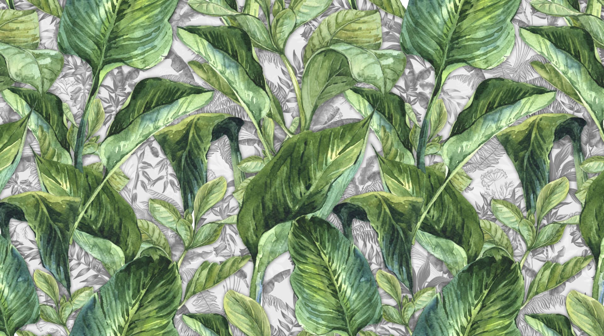Zwischen großflächigen, tropisch anmutenden Blättern verbergen sich zarte florale Skizzen im Hintergrund – ein Spiel aus Vordergrund und Tiefe, aus Farbe und Graustufen. Die Aquarelltechnik bringt Transparenz, Leichtigkeit und Dynamik in die Szenerie.