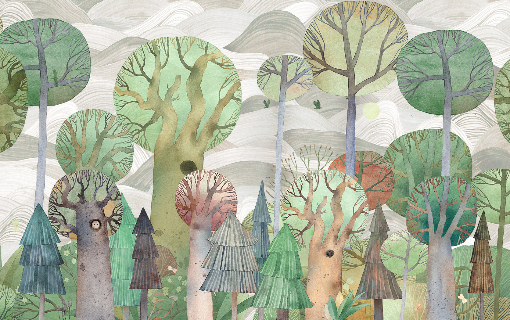 „Im Wäldchen“ entführt in eine fantasievolle Welt voller stilisierter Bäume und sanfter Farben. Die verspielte, fast kindliche Komposition wirkt wie eine Illustration aus einem poetischen Bilderbuch. Unterschiedlichste Baumformen – von rund bis zackig – stehen dicht an dicht und erzählen in ihrer Vielfalt von Lebendigkeit und Ruhe zugleich.