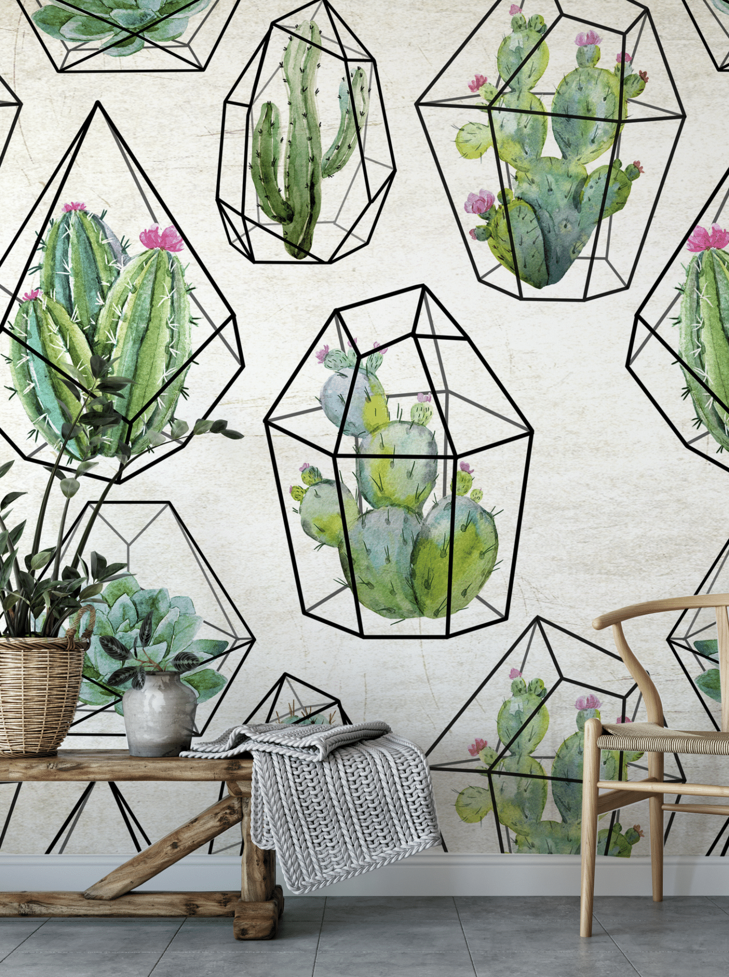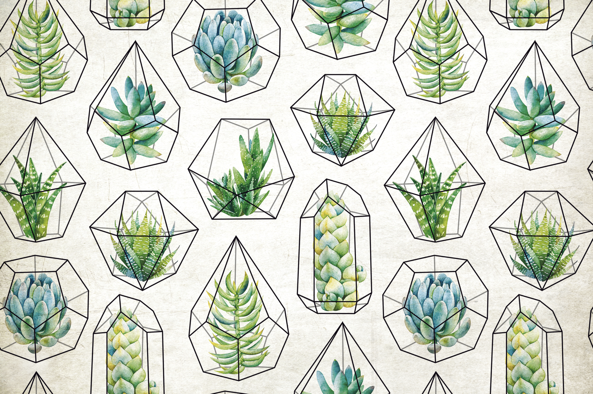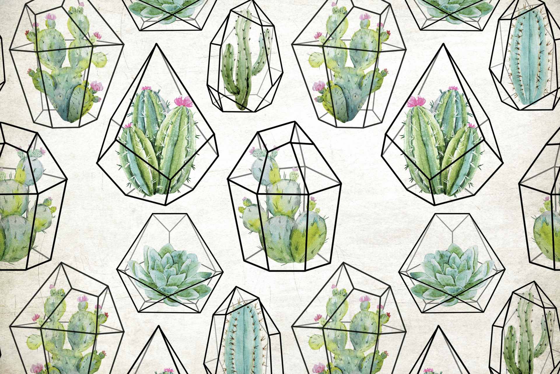In „Kakteengewächse“ verschmelzen botanische Formen mit grafischer Klarheit. Sukkulenten und Kakteen, detailreich in Aquarelltechnik illustriert, sitzen in stilisierten geometrischen Glasformen wie in kleinen Terrarien. Die Komposition wirkt frisch, modern und gleichzeitig liebevoll natürlich.
