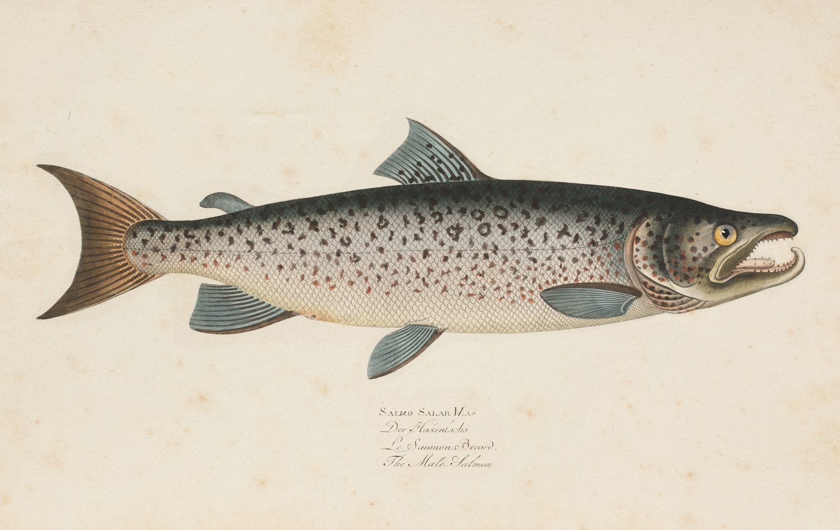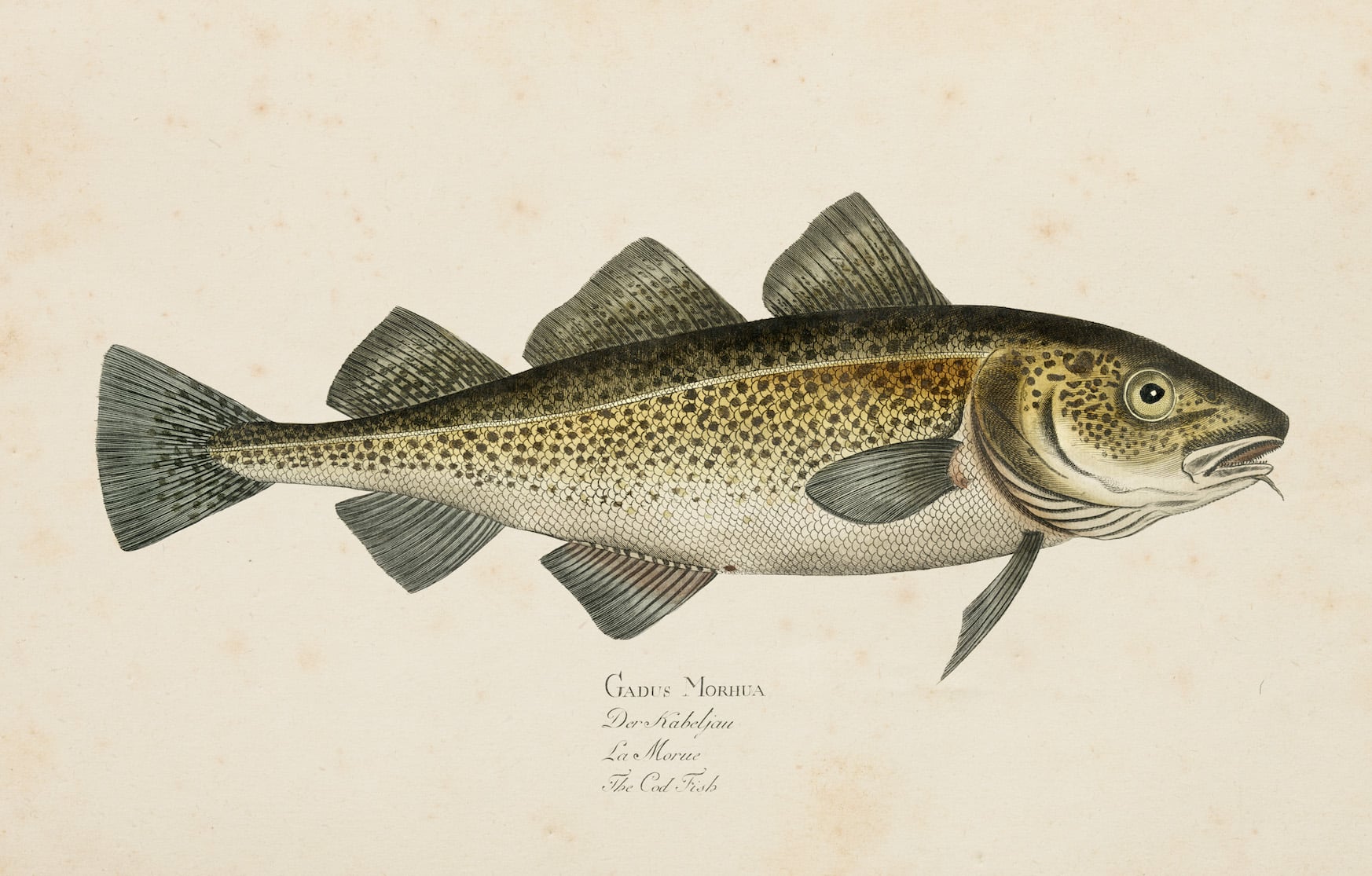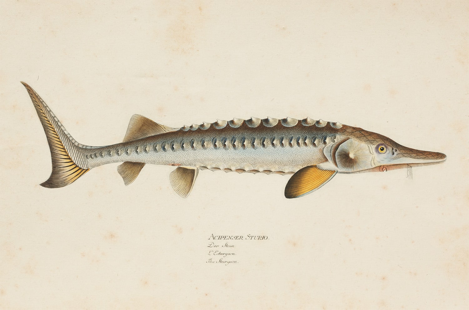 Die „Kleine Fischkunde“ ist eine Hommage an die Ästhetik naturwissenschaftlicher Illustration aus dem 18. und 19. Jahrhundert. Vier detailgetreue Darstellungen klassischer Speisefische – darunter Stör, Lachs, Kabeljau und Thunfisch – sind in feinster Aquarell- und Tuschtechnik auf zart gealtertem Pergamenthintergrund arrangiert. Die lateinischen und französischen Benennungen verleihen dem Gesamtwerk eine museale Eleganz und wissenschaftliche Tiefe.