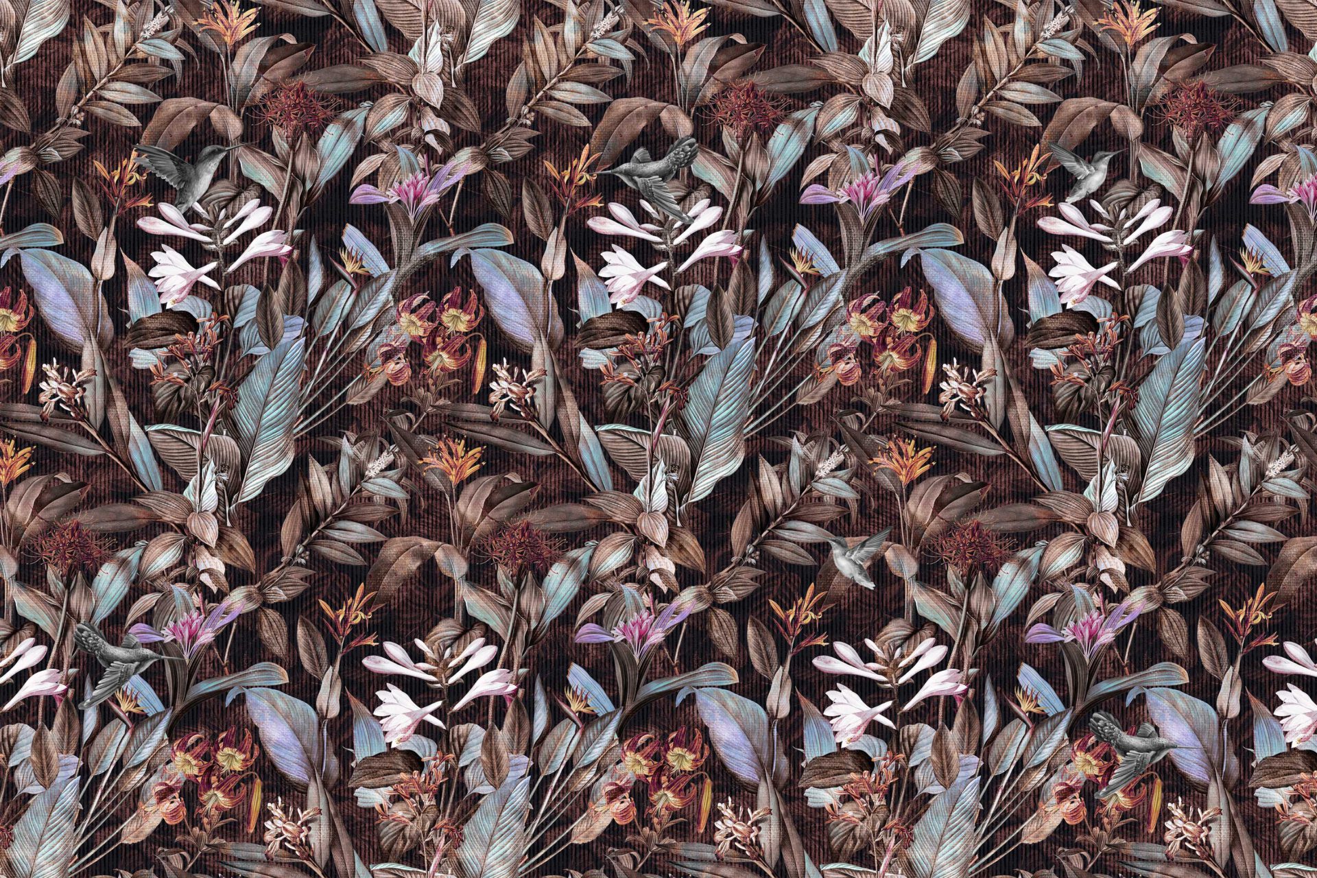 Die Farbstimmung wirkt wie ein Gedicht der Dämmerung: tiefe Braun- und Kupfertöne, durchzogen von sanften Blau- und Violettakzenten. Das dunkle Grundrauschen der Tapete lässt jedes Detail leuchten – als würde das Leben selbst im Hintergrund pulsieren.