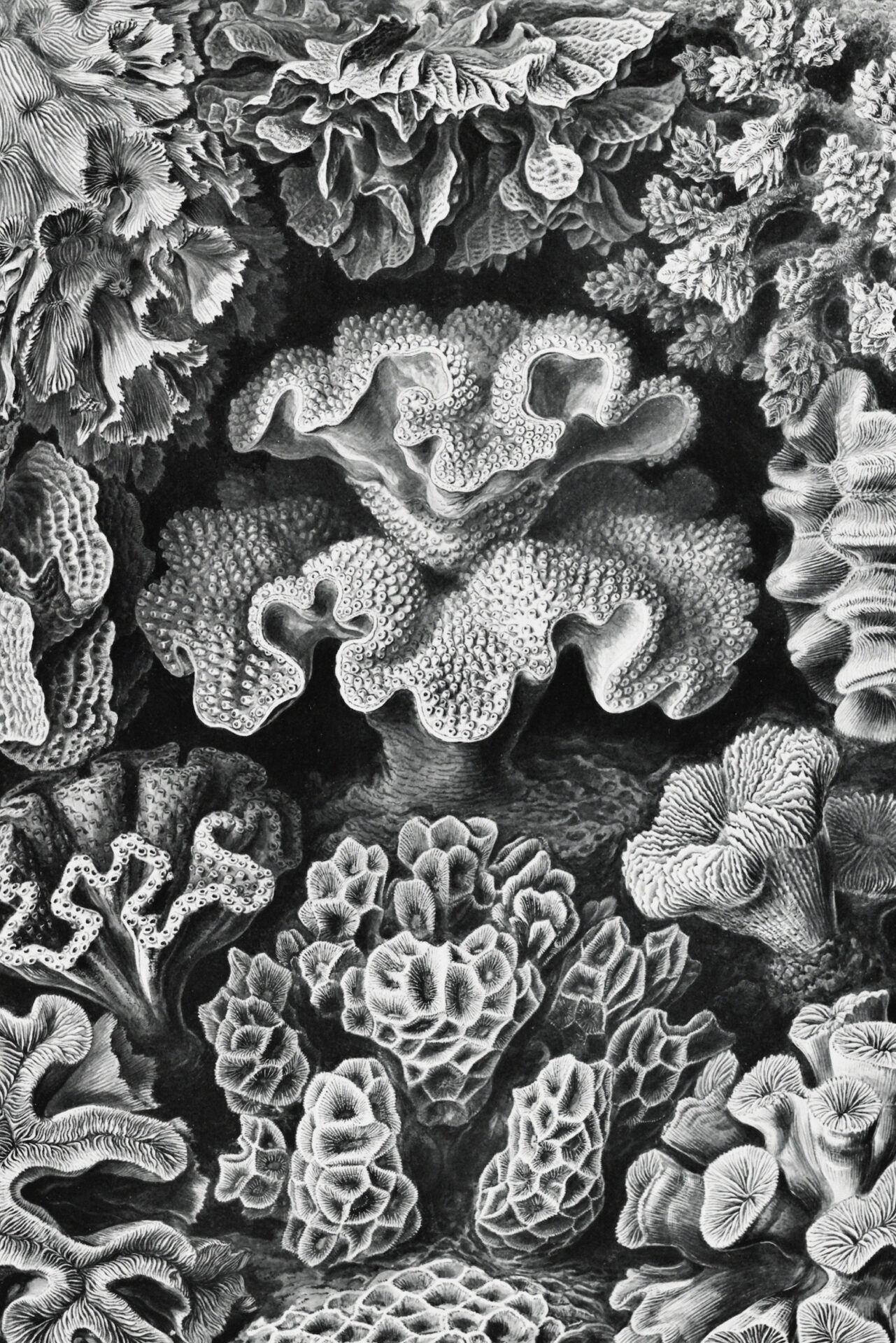 „Korallen“ ist eine Hommage an das stille Wunder unter dem Meeresspiegel. Schwarz-weiß wie eine antike Gravur und zugleich voll vibrierender Lebendigkeit – dieses Werk fängt die Vielfalt mariner Strukturen in grafischer Präzision ein. Es erinnert an das pulsierende Herz des Ozeans, eingefroren im Tanz der Zeit.