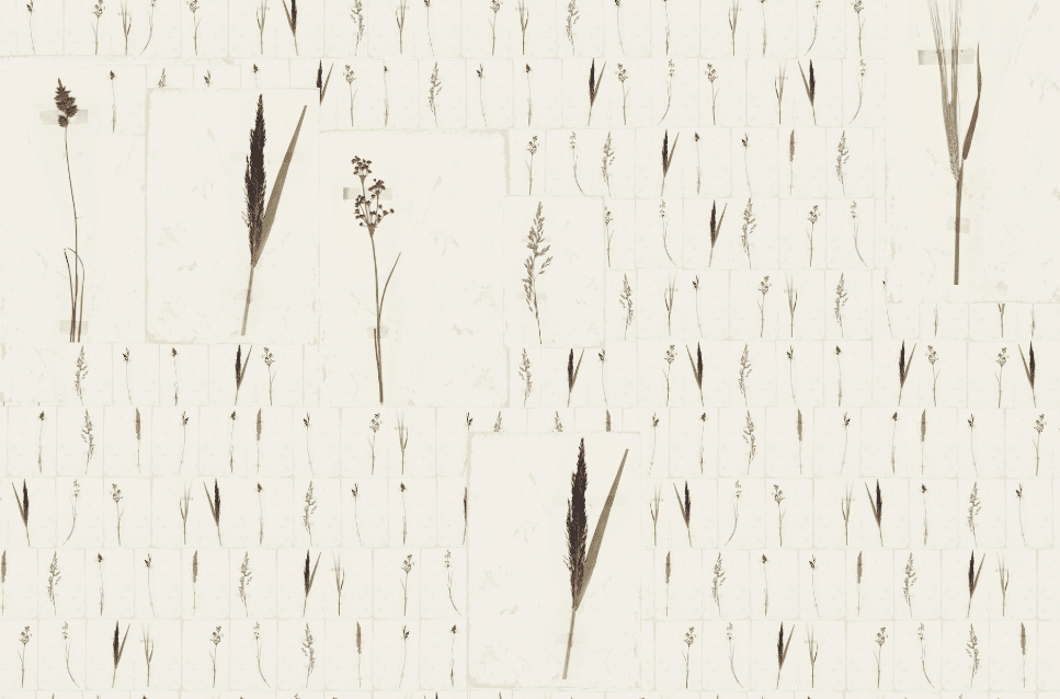 „Korn“ ist eine Hommage an die stille Schönheit botanischer Vielfalt. Auf einer cremeweißen Fläche sind zahllose Gräser und Ähren in akribischer Ordnung arrangiert – wie ein wissenschaftliches Herbarium oder eine naturkundliche Sammlung. Jedes Pflanzenelement wirkt zart, reduziert und handverlesen. Der Hintergrund bleibt dezent und lässt den filigranen Strukturen Raum zur Entfaltung.
