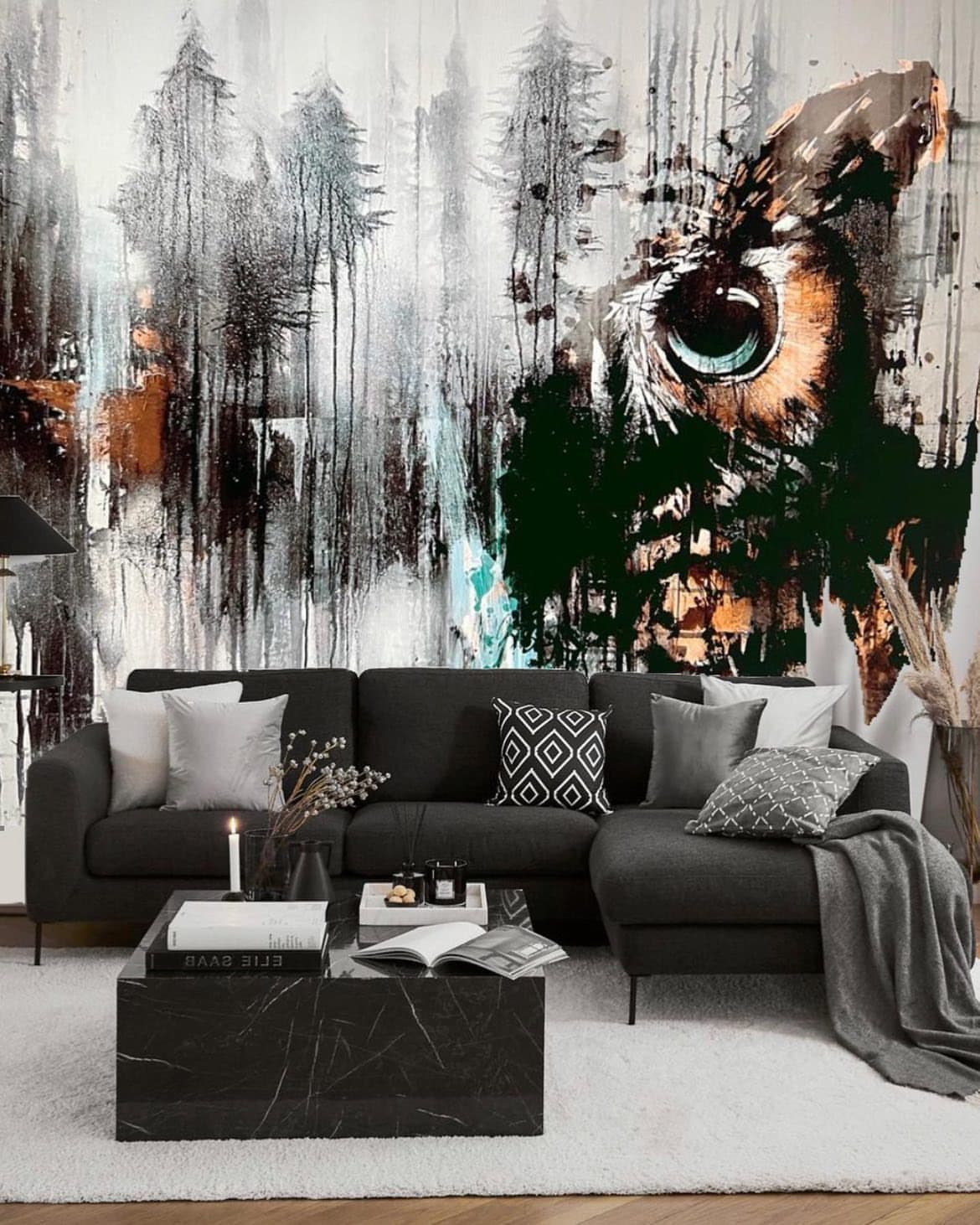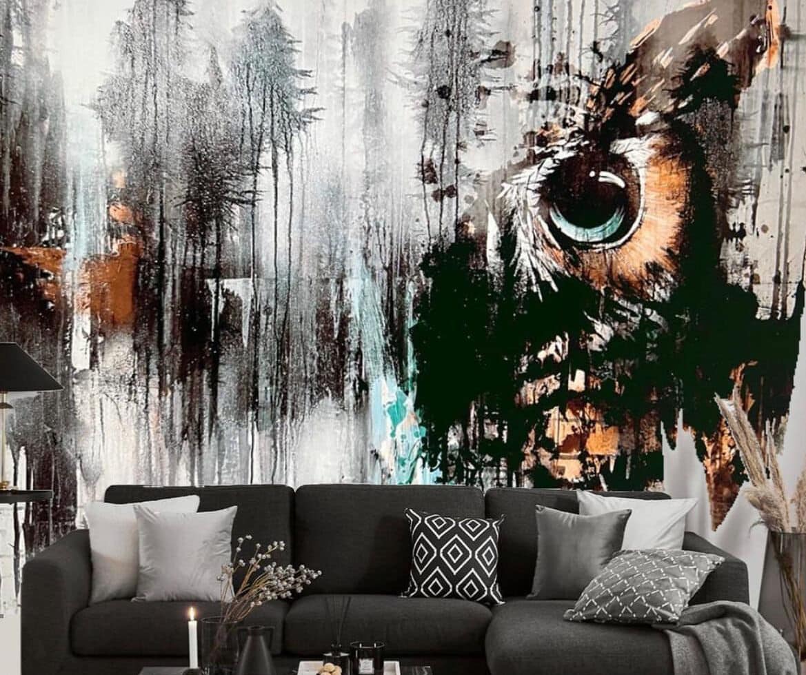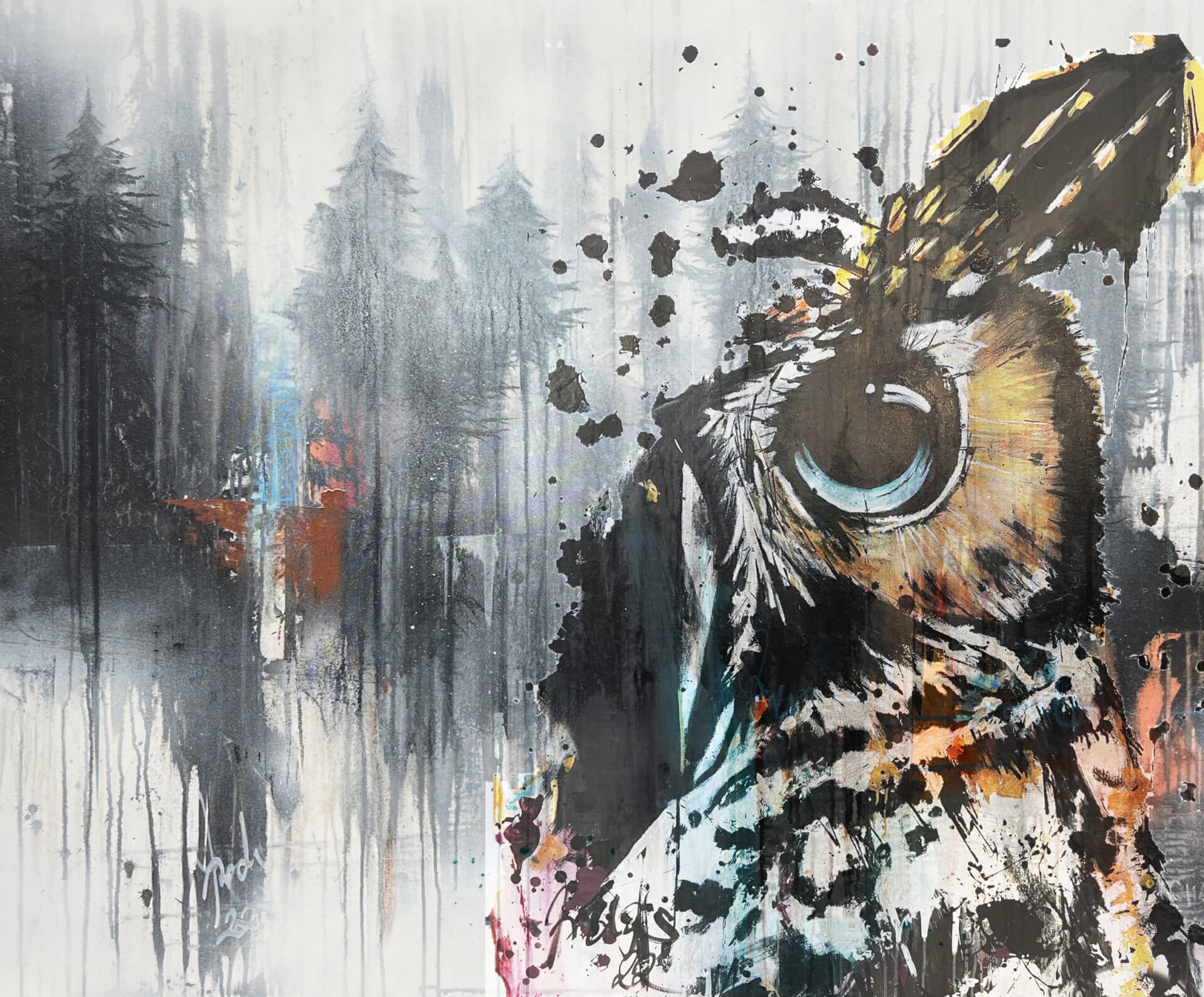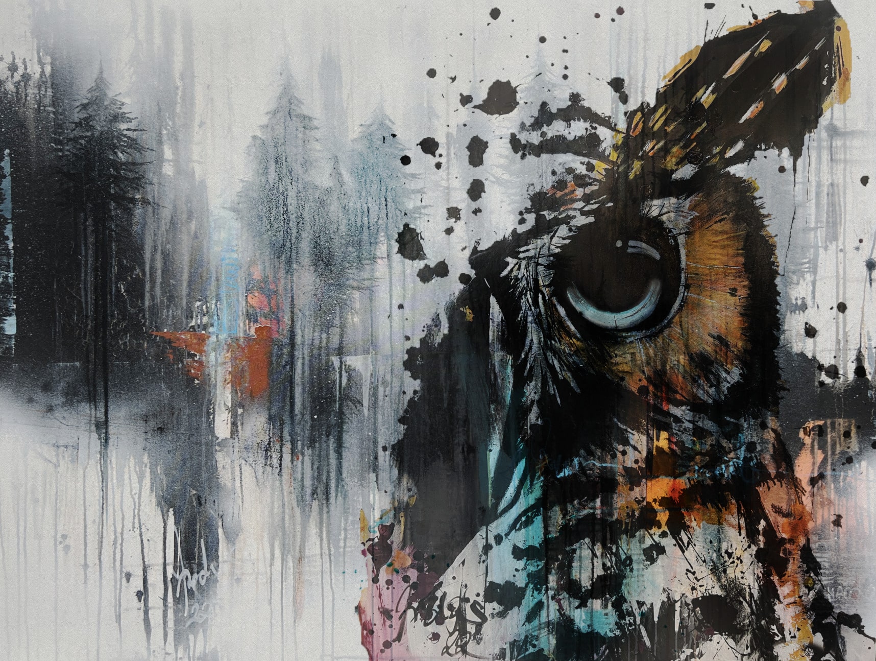 „Die Eule“ ist ein Wesen zwischen Nebel und Nacht, zwischen Farbe und Stille. Ihr Blick ist durchdringend, wachsam – als würde sie mehr wissen, als der Moment je offenbart. Die rechte Bildhälfte zeigt ihr Auge groß und klar, während die linke Seite in einen nebelhaften, fast magischen Wald übergeht.