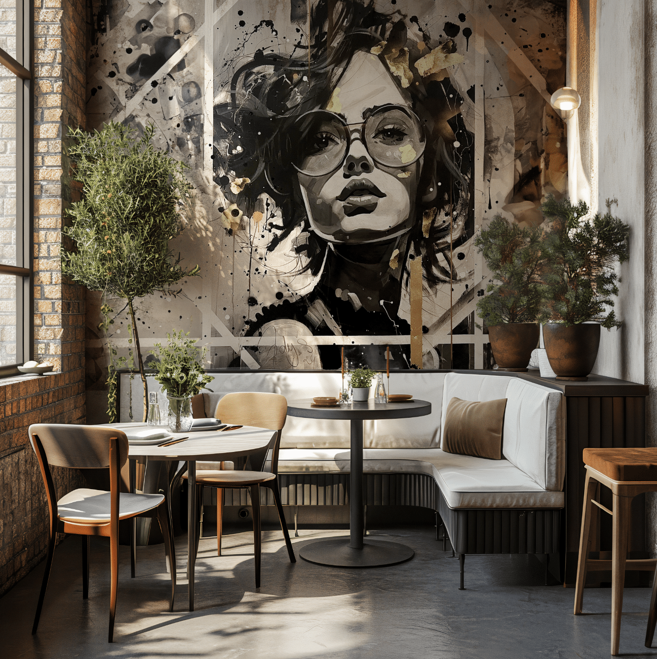 Die Farbwelt ist ein Tanz aus Schwarz, Weiß, Taupe und Gold – urban und warm zugleich. Die geometrischen Rahmenelemente bringen Klarheit in die expressive Szenerie. Ein Kunstwerk voller Haltung und Charakter – für Räume, die selbstbewusst wirken wollen.