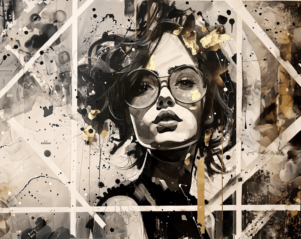 Sie schaut dich an. Direkt. Selbstsicher. Unbeirrbar. Rachel ist eine moderne Muse – irgendwo zwischen Fashion-Porträt, Street-Art und Leinwandpoesie. Großformatig, grafisch und ausdrucksstark. Die feminine Figur trägt eine runde Brille, goldene Reflexe im Haar, umgeben von einem Strudel aus Farbe, Linien, Spritzern und Strukturen.