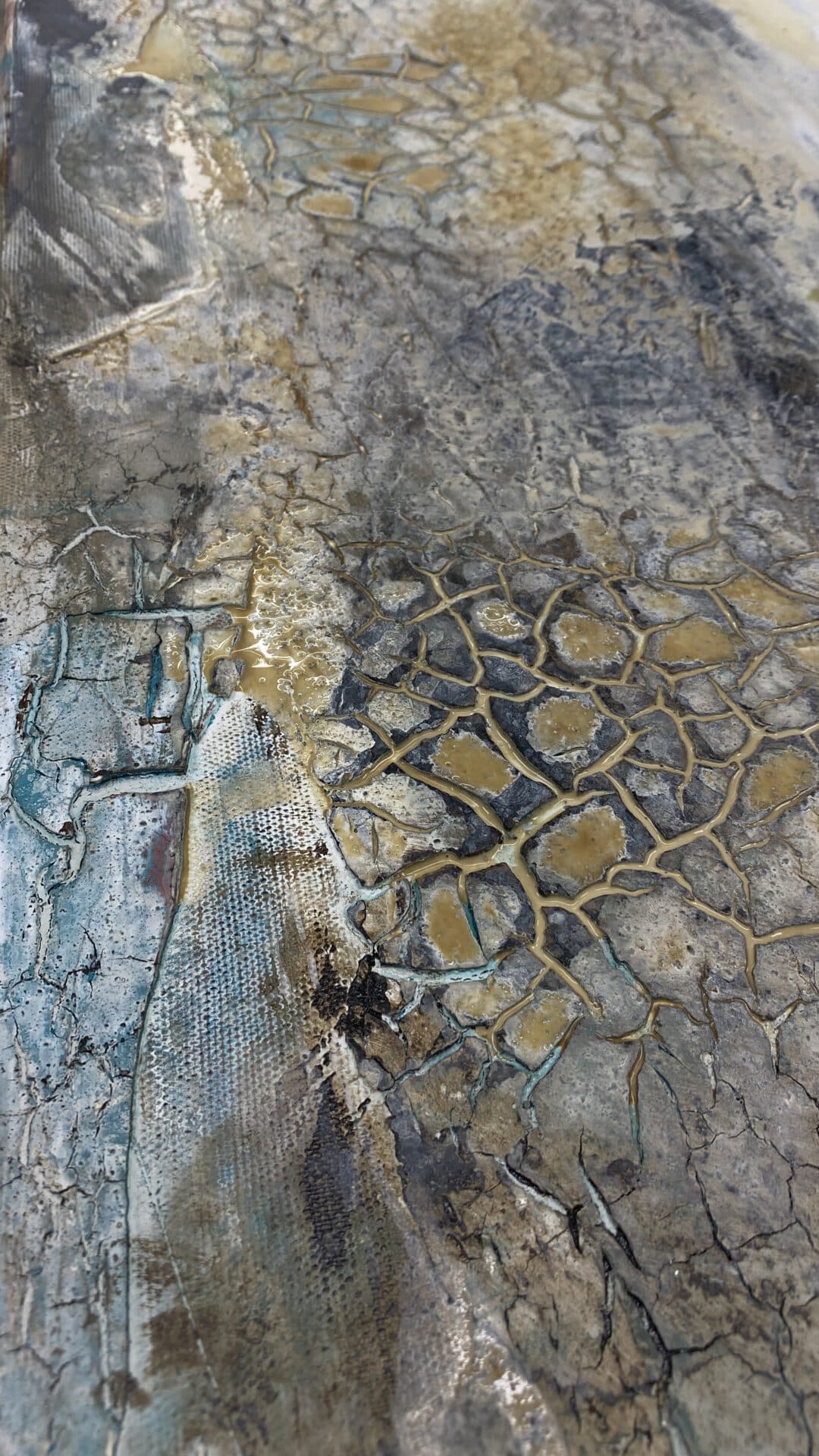 Goldene Linien durchziehen die Oberfläche wie Adern, darunter kühle Türkis- und Ockertöne, gebrochenes Gestein, gelebte Oberfläche. Jede Stelle scheint eine Geschichte zu bergen – von Druck, von Wandlung, von neuem Leben.
