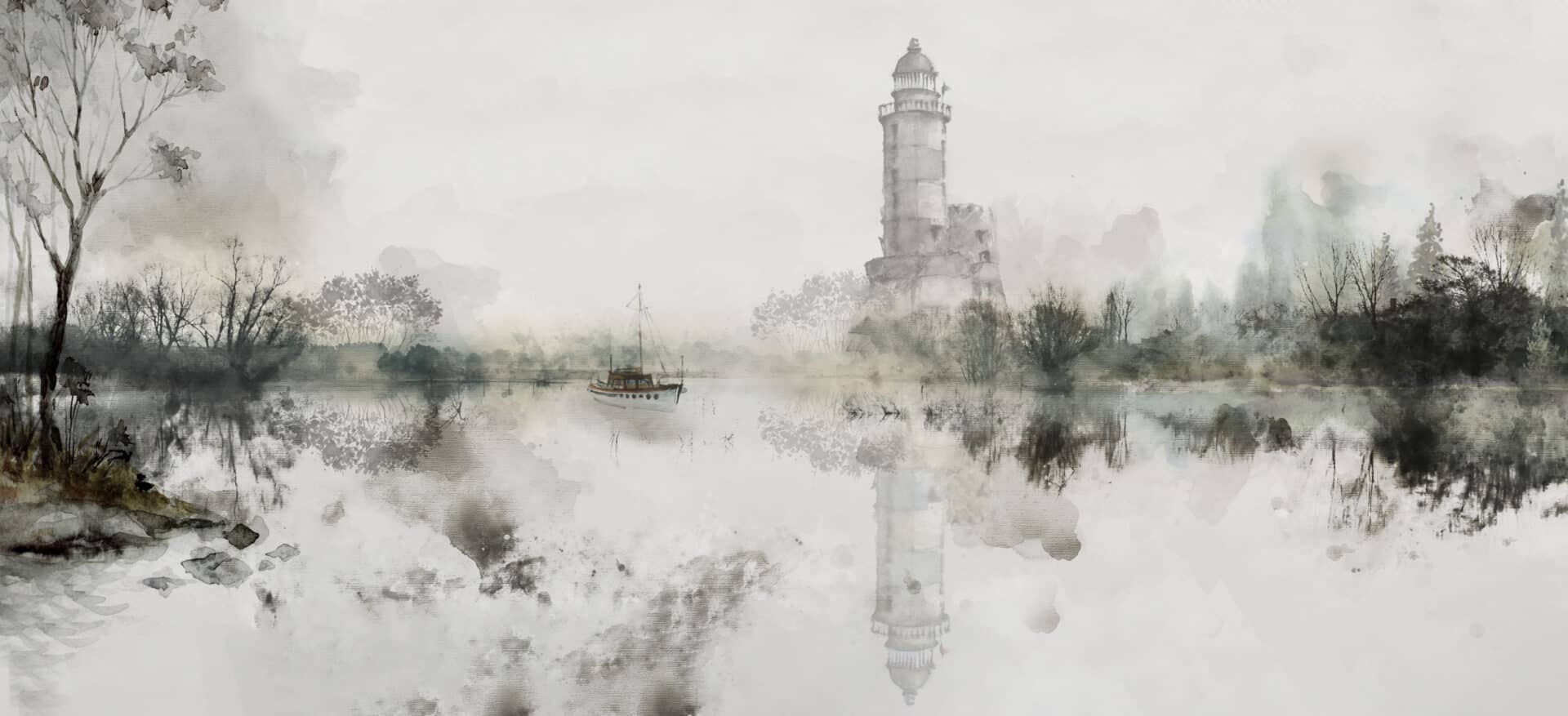 „Leuchtturm“ ist wie ein Echo über ruhigem Wasser – ein Sinnbild für Orientierung, Einsamkeit und leise Stärke. In sanften Nebel getaucht erhebt sich der Turm wie ein Wächter über der Szenerie. Alles spiegelt sich – die kargen Ufer, das stille Boot, der Himmel selbst. Eine Komposition zwischen Traum und Erinnerung.