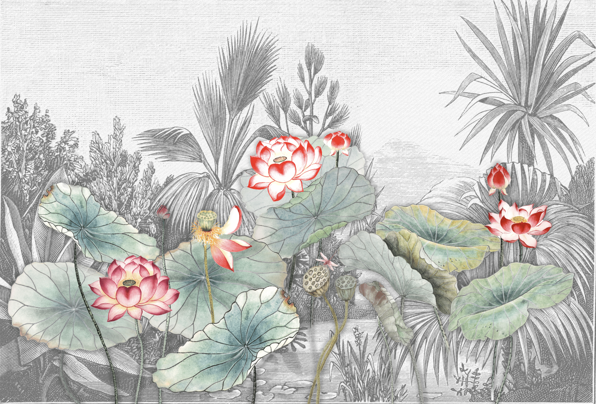 In „Lotus“ entfaltet sich eine botanische Komposition wie aus einem alten Naturkundebuch – präzise, zart, zeitlos. Üppige Lotusblätter in sanftem Grün und Grau treffen auf leuchtende Blüten in Rosé und Rot. Dazwischen feine Schraffuren, detailreiche Zeichnungen exotischer Pflanzen, eingebettet in eine ruhige, helle Szenerie. Stillleben und Illustration verschmelzen zu einer poetischen Momentaufnahme.
