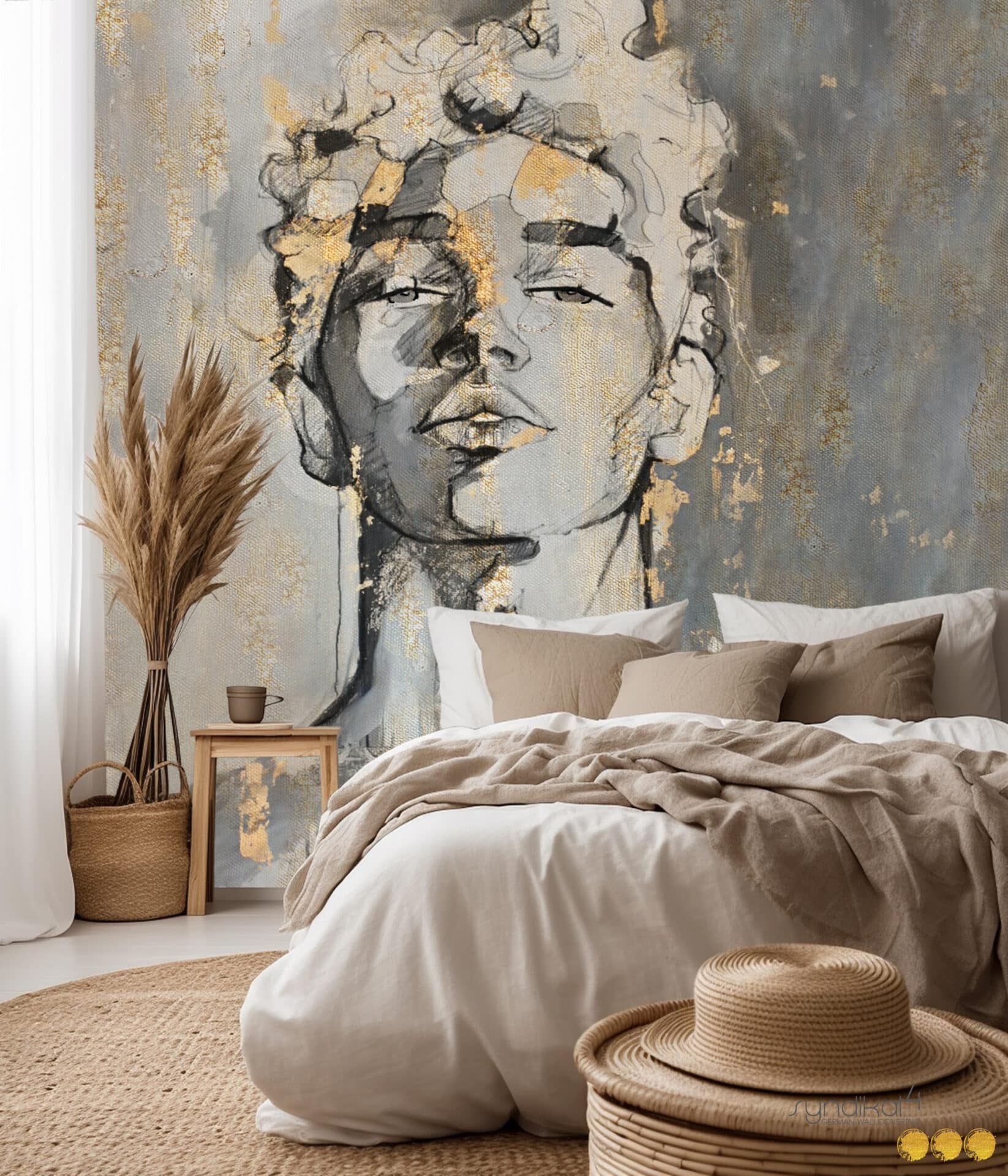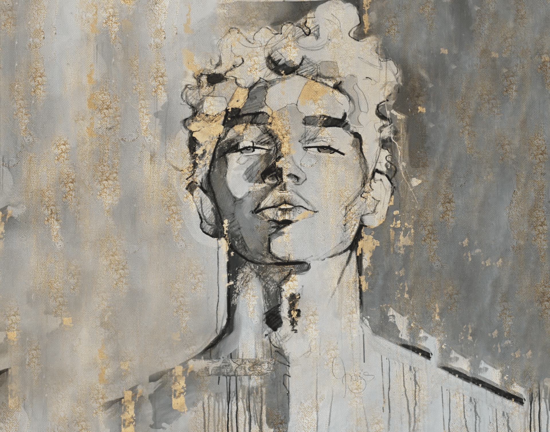 „Mr Grey“ ist mehr als ein Portrait – es ist ein Blick in die Tiefe. Die Figur wirkt gleichzeitig stark und fragil, fast entrückt aus der Zeit. Goldene Akzente schimmern durch raue Strukturen, als würden sie Geschichten erzählen, die nur im richtigen Licht sichtbar werden.
