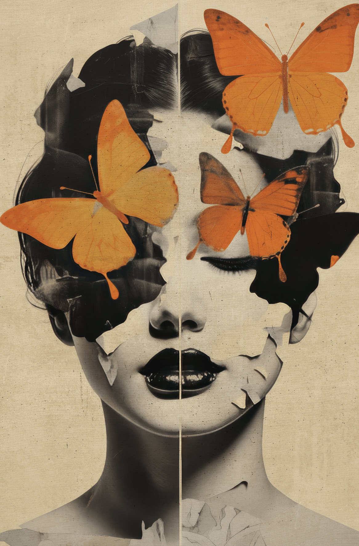 Die Farbwelt ist poetisch zurückhaltend: Sepia- und Sandtöne bilden die Leinwand, auf der das lebendige Orange und Gelb der Schmetterlinge kraftvolle Akzente setzen. Der Kontrast zwischen Schwarzweißportrait und farbiger Natur schafft ein Spannungsfeld aus Ruhe und Aufbruch – ein Stillleben voller Bewegung.