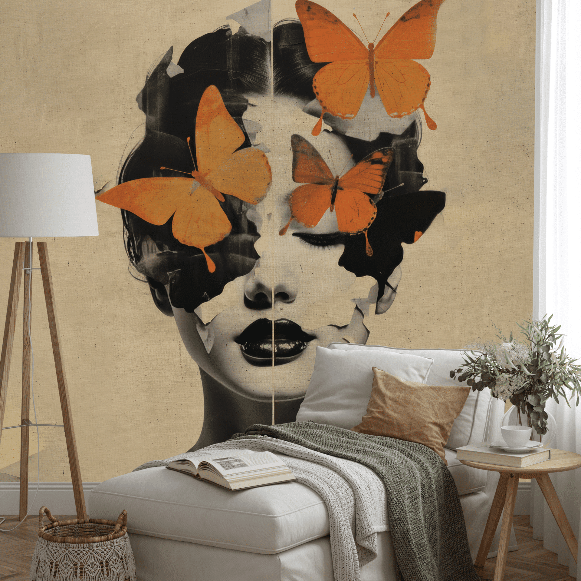 Wie ein leiser Tagtraum entfaltet sich „My Butterfly“ auf der Wand – eine Hommage an weibliche Stärke, Sinnlichkeit und die zarte Kraft der Metamorphose. Die Darstellung einer Frau mit geschlossenen Augen wirkt wie in Trance: Sie ist ganz bei sich – und gleichzeitig eins mit ihrer Umgebung. Aus ihren Gedanken steigen Schmetterlinge empor – orange, gelb, ocker – Symbole der Veränderung, der Schönheit und der Freiheit.
