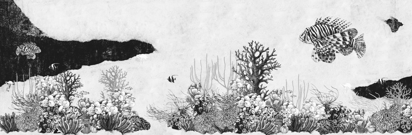 Ein lebendiges Korallenriff entfaltet sich in detailreicher Vielfalt: „Ocean“ zeigt eine faszinierende Unterwasserwelt mit exotischen Fischen, zarten Anemonen und korallenartigen Strukturen in Rosa, Violett, Blau und Rot. Die feine Zeichentechnik erinnert an naturkundliche Illustrationen, kombiniert mit modernem Farbakzent – poetisch und lebendig zugleich.