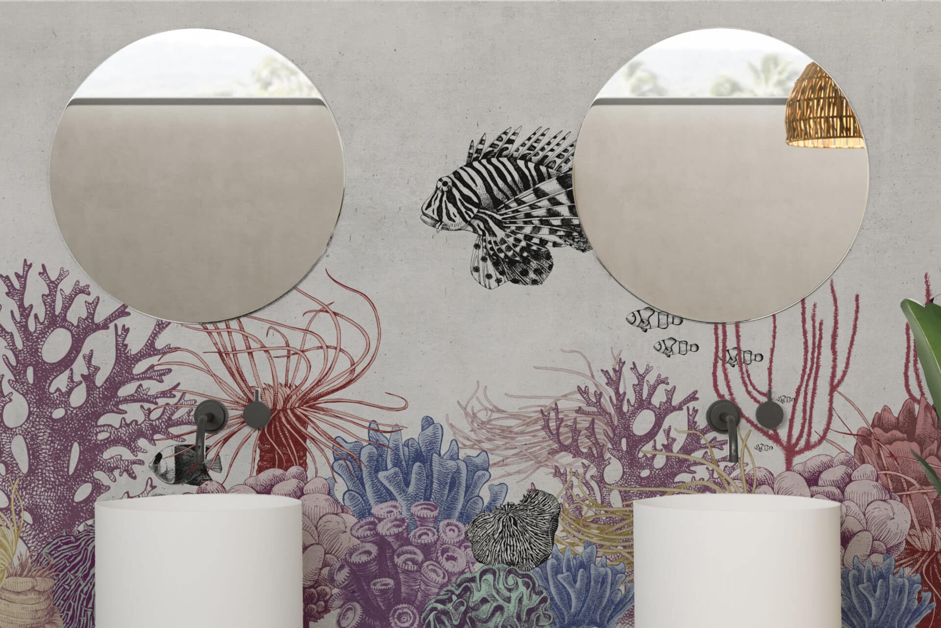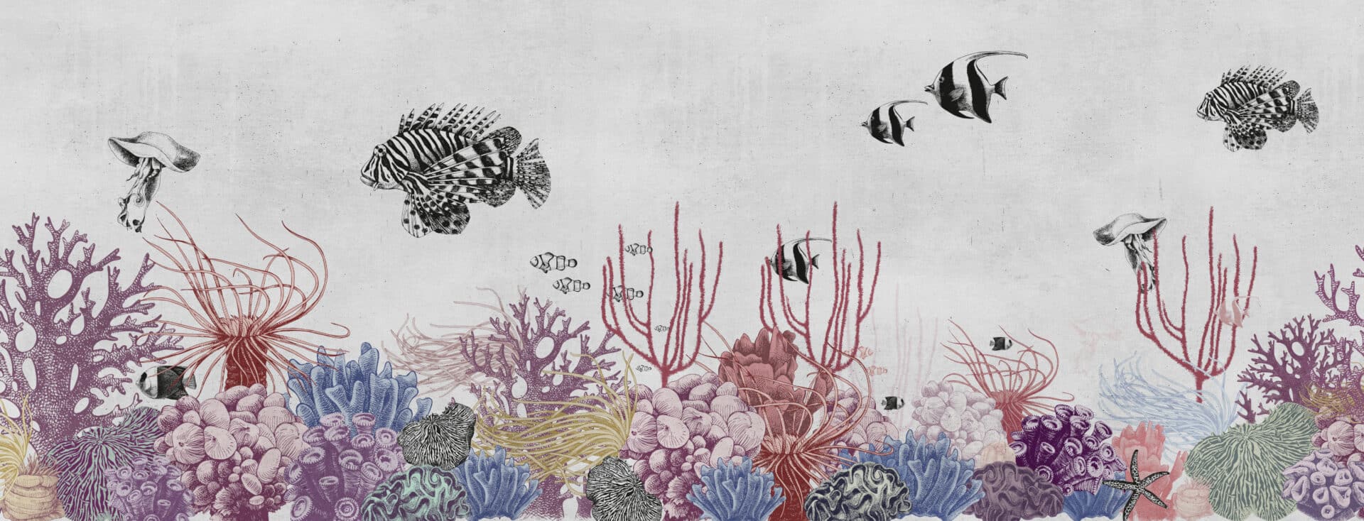 Ein lebendiges Korallenriff entfaltet sich in detailreicher Vielfalt: „Ocean“ zeigt eine faszinierende Unterwasserwelt mit exotischen Fischen, zarten Anemonen und korallenartigen Strukturen in Rosa, Violett, Blau und Rot. Die feine Zeichentechnik erinnert an naturkundliche Illustrationen, kombiniert mit modernem Farbakzent – poetisch und lebendig zugleich.