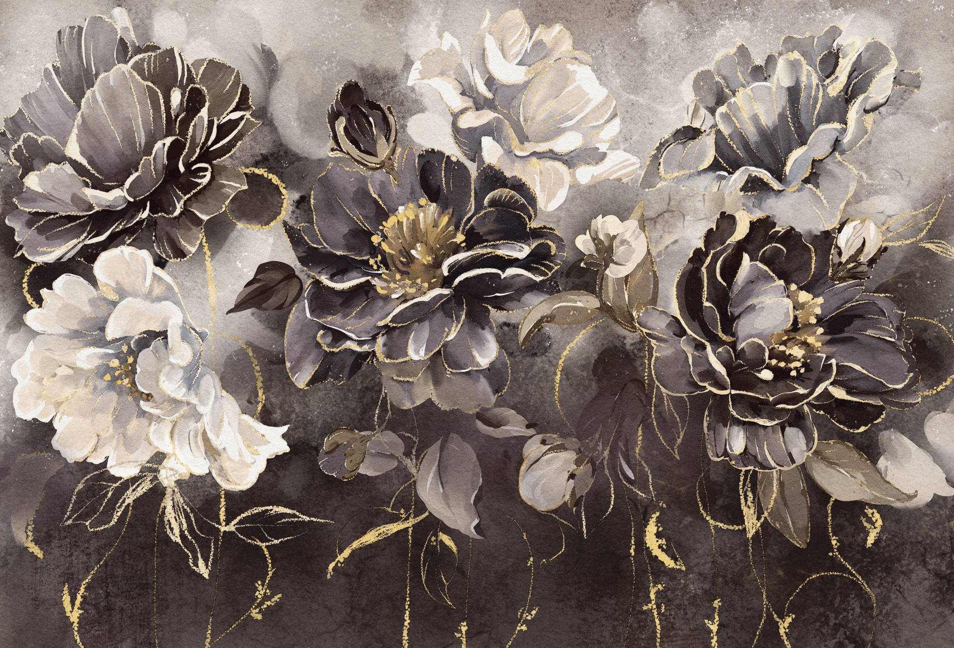 Zarte Goldadern durchziehen die florale Komposition, als würde Licht zwischen den Blättern flüstern. Die Blüten sind kraftvoll, aber nicht laut – sie atmen Luxus, Nostalgie und handwerkliche Tiefe.