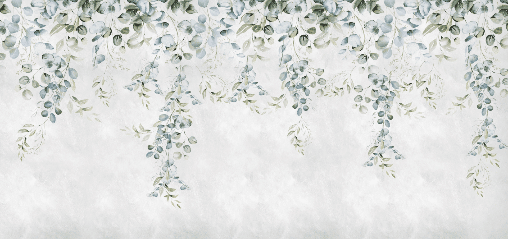 Ranken schwebt. Feine Eukalyptuszweige, zart gezeichnet in kühlen Graugrün- und Blaugraunuancen, hängen wie ein lebendiger Vorhang von oben herab. Die florale Komposition wirkt organisch und zugleich grafisch – natürlich, aber stilisiert. Der Hintergrund ist sanft wolkig, fast wie Nebel oder Kalkputz – zurückhaltend, aber nicht leer.