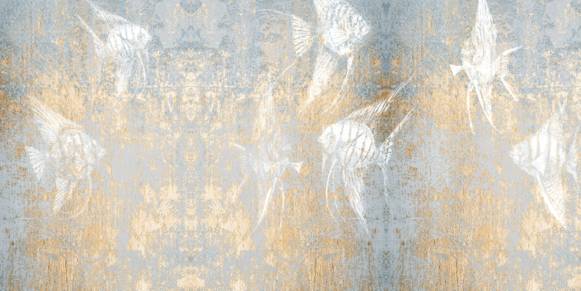 Das Werk vereint grafische Klarheit mit barocker Opulenz: Fischsilhouetten treten aus dem Hintergrund hervor, nur angedeutet – wie Erinnerungen im Licht. Gold- und Silbertöne fließen über kalkige Blaunuancen und verleihen dem Bild Tiefe, Glanz und Stille zugleich.
