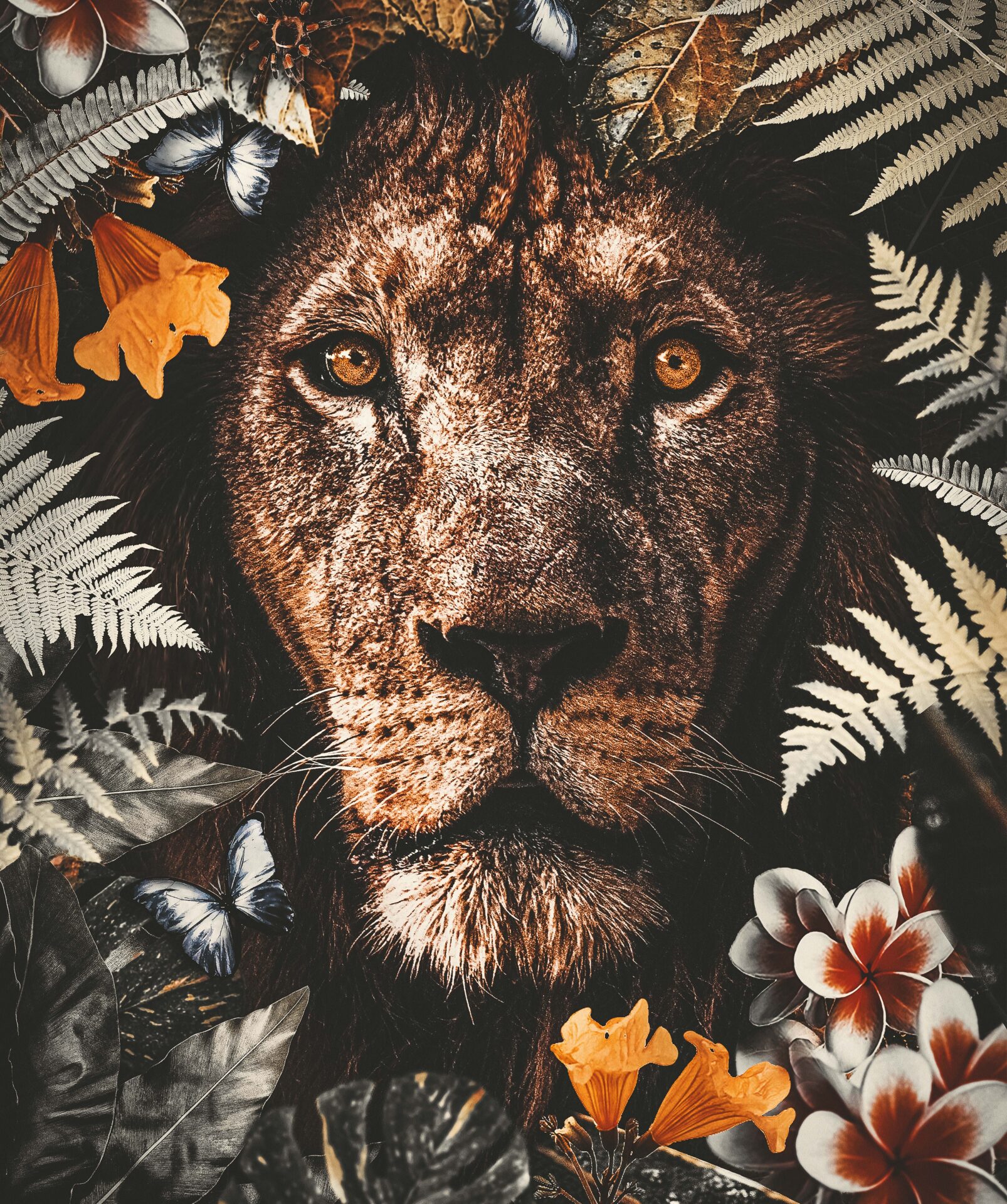 In diesem eindrucksvollen Porträt trifft die ungezähmte Kraft der Wildnis auf die Sinnlichkeit floraler Poesie. Der Blick des Löwen – ruhig, wachsam, voller Tiefe – wird umrahmt von Blüten, Farnen und Schmetterlingen, die wie ein natürlicher Thron wirken.
