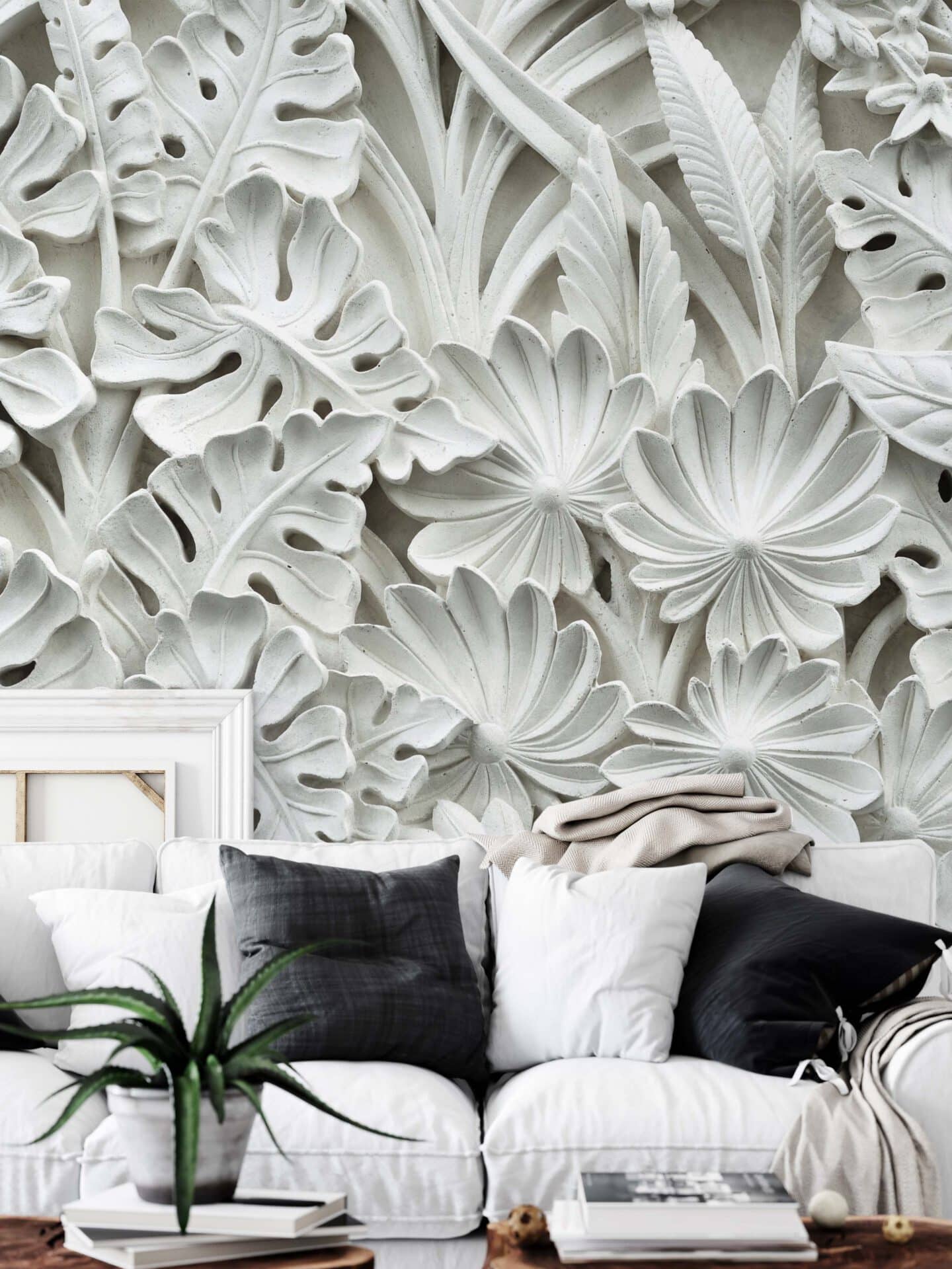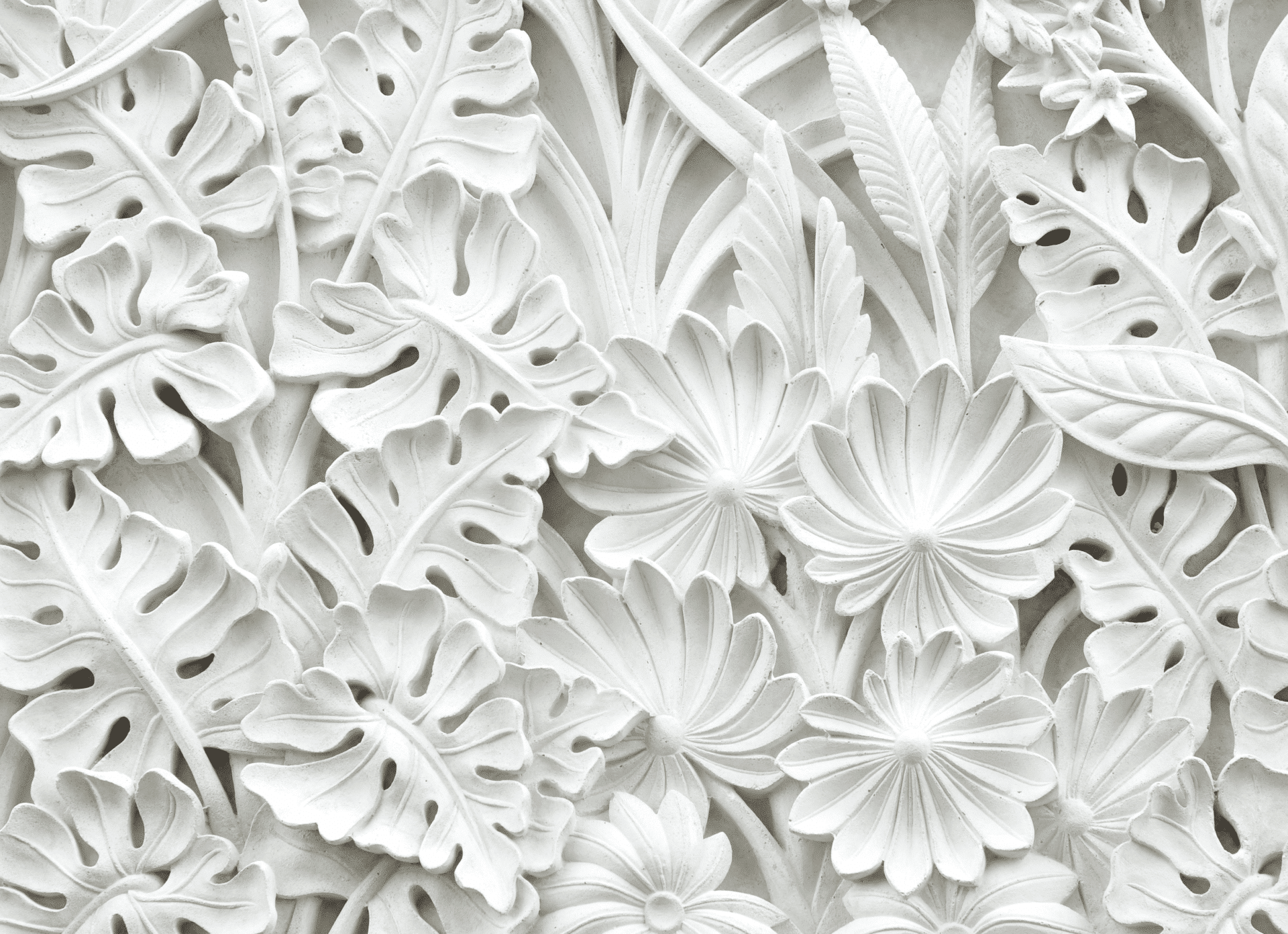 „Stukko Roses“ ist wie ein Wandrelief aus einem Traum. Blätter, Blüten, Palmen und Rosetten schmiegen sich ineinander – ganz in Weiß, ganz in Ruhe. Die floralen Formen treten plastisch hervor, als wären sie aus feinem Porzellan modelliert, aus Licht gegossen oder in Stein geflüstert.